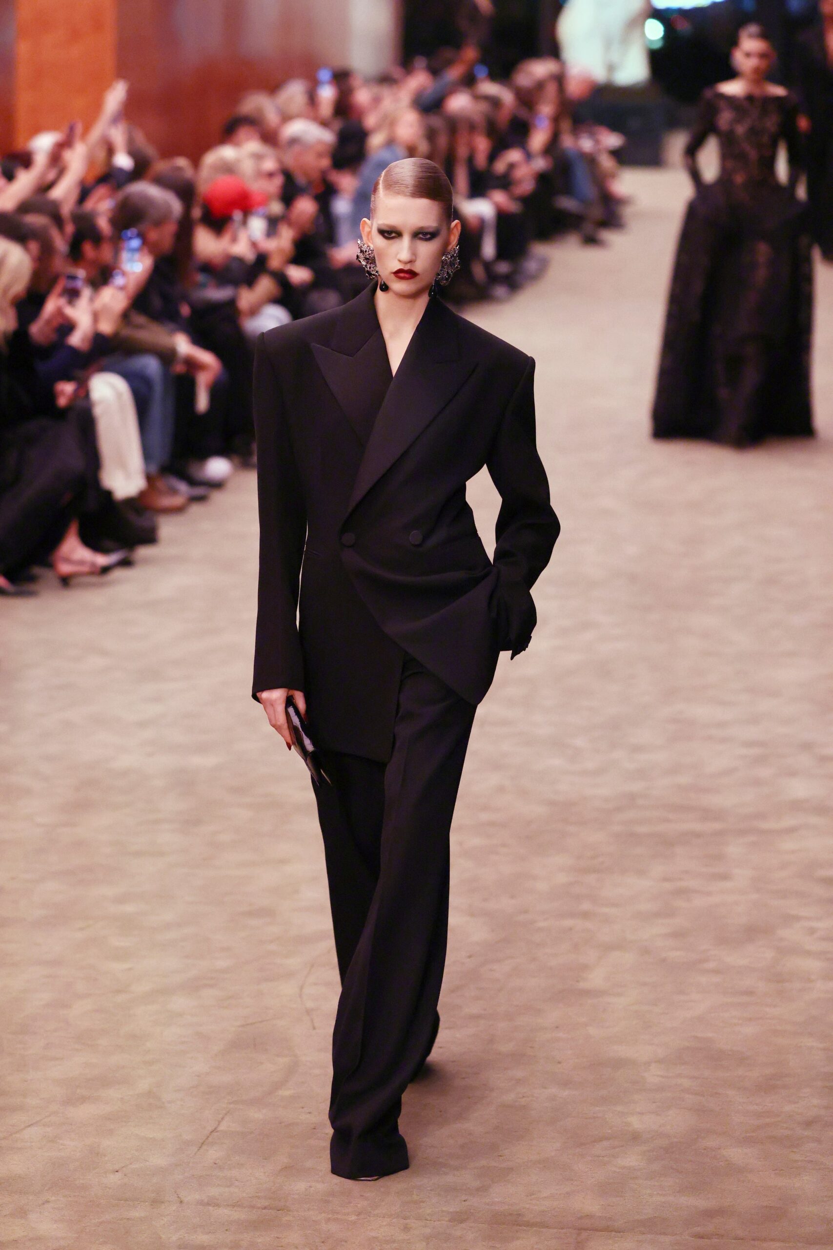 Models wore side-parted hair slicked tightly into low buns, paired with smoky eyes, contoured cheekbones and deep red lips created by make-up artist Pat McGrath – seemingly a reference to the dramatic beauty seen in photographer Helmut Newton’s Saint Laurent campaigns of the 1970s and 1980s.