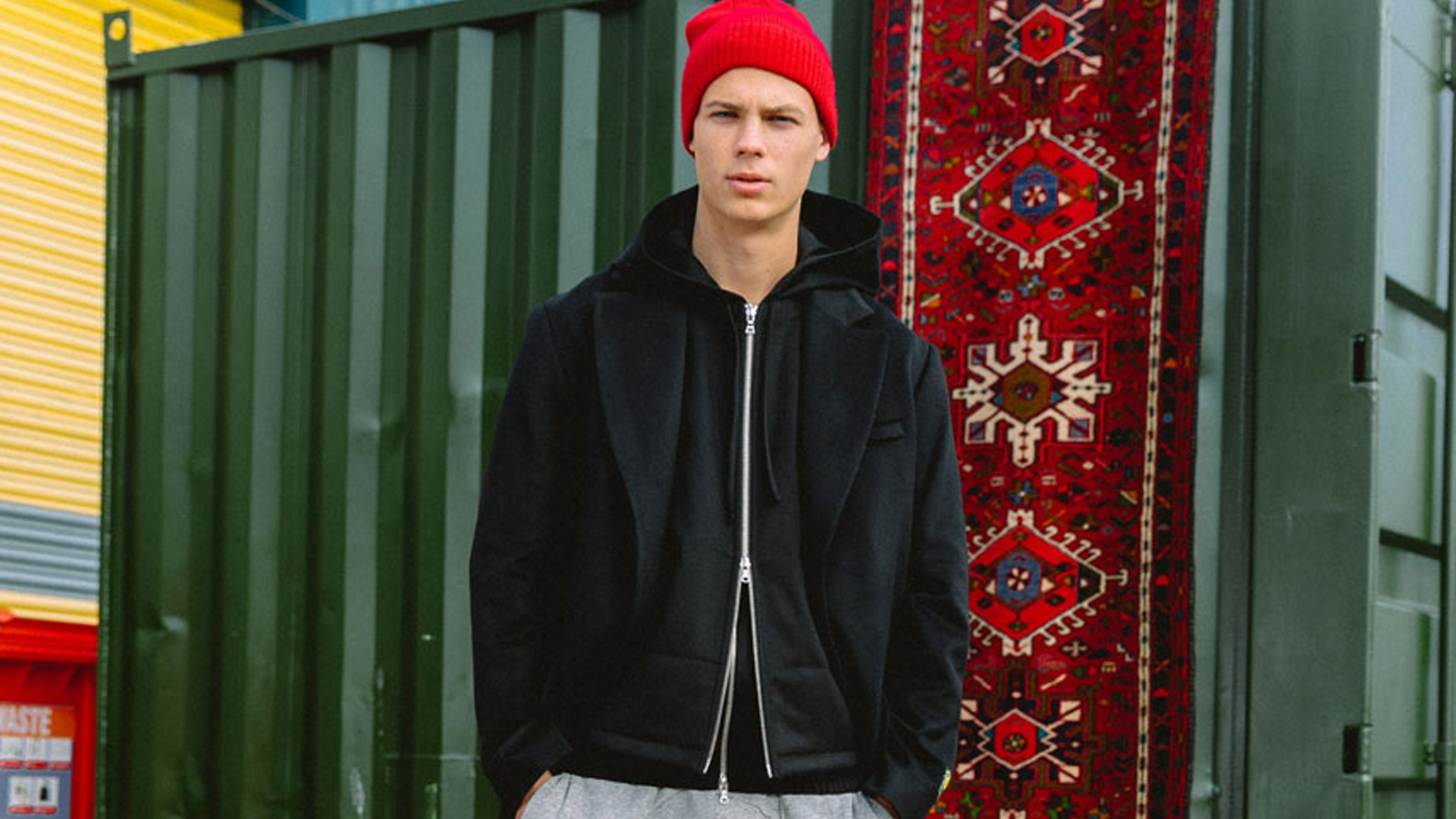 Inspired by counter-culture and tailoring, the first part of the collection sees pure cashmere cloth from Loro Piana turned into track pants, a zip-through hoodie, a padded vest and a tailored overcoat with an LP arm patch.