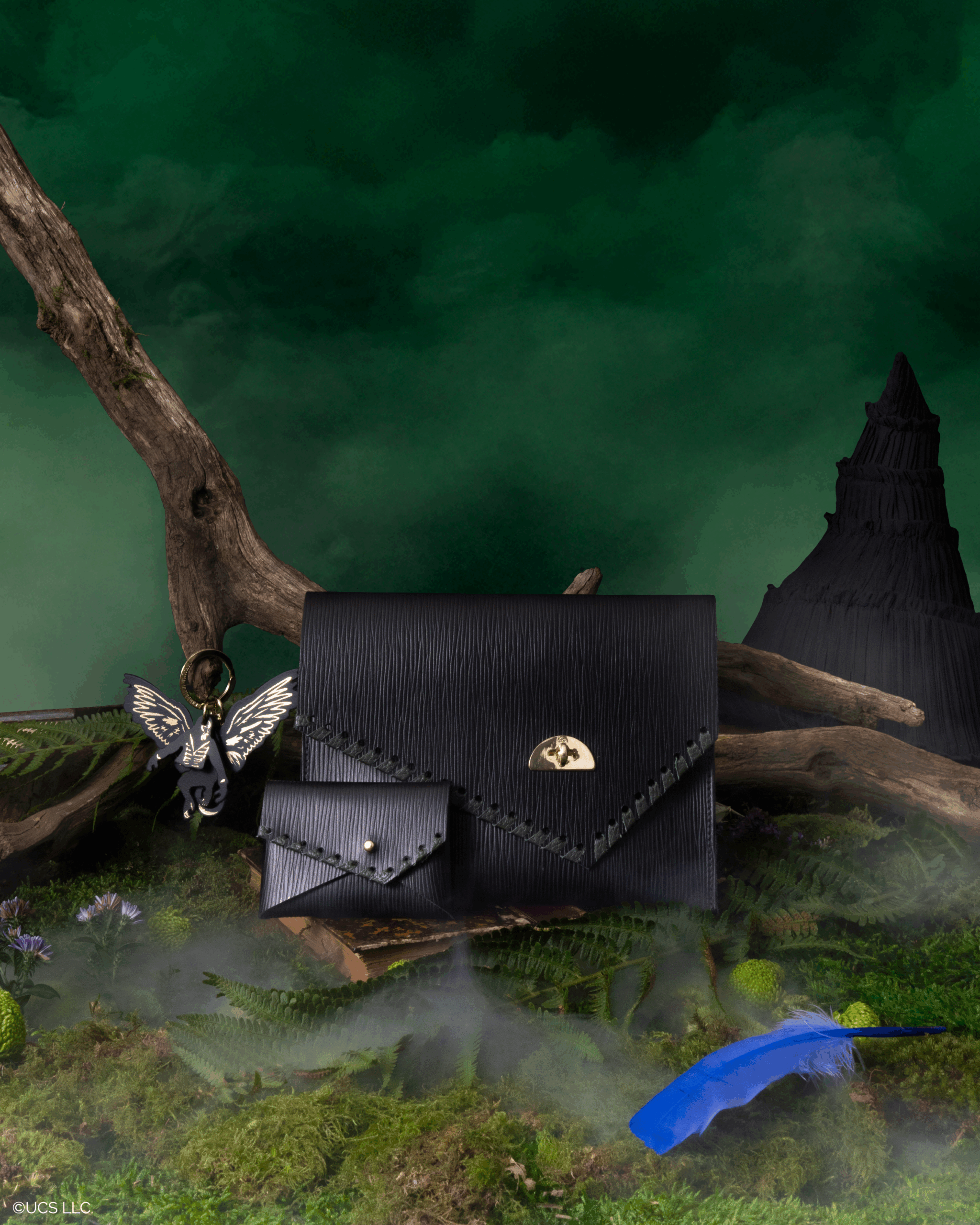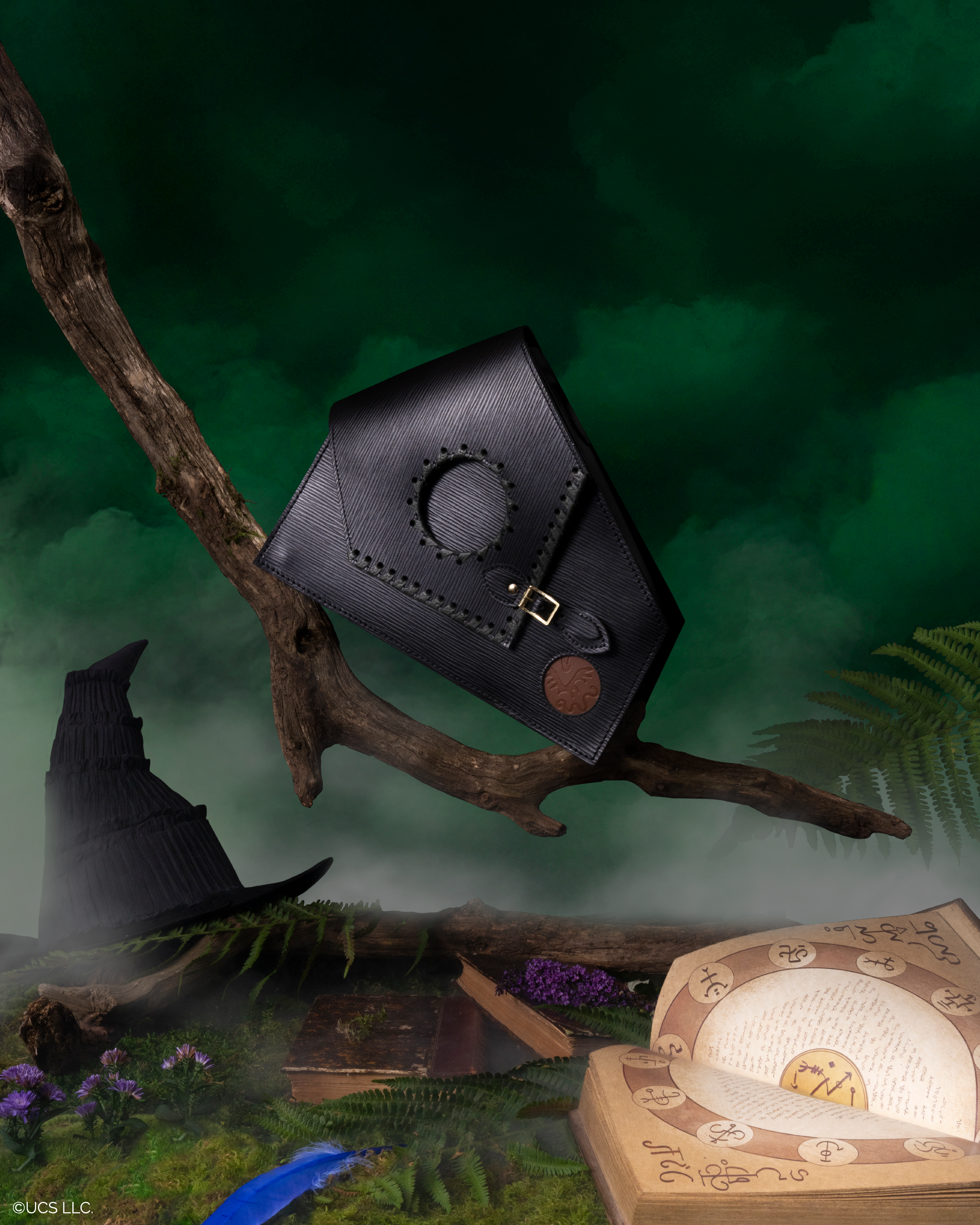 For the dark and defiant, Elphaba-inspired pieces return with fierce individuality. The star of the show, The Grimmerie Bag, nods to the enchanted book seen on screen. It's crafted in split leather with bold, blanket stitching and fern-like patterns that evoke her woodland lair. In addition, the Twist-Lock Pouch mirrors the witch’s raw power with asymmetrical details and deep, earthy tones.