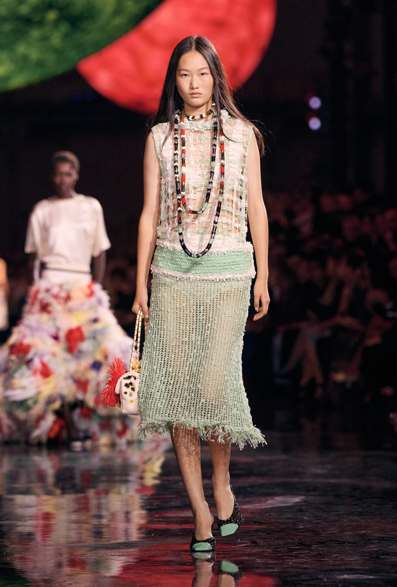 Backstage, Blazy reflected on Chanel’s legacy: "We tend to forget because the myth of Chanel makes her a very serious woman. I found a picture of her with a flamenco dress, having fun. She decided for herself what she could be. The good thing with the codes of Chanel is that you can also reduce them; they still look like Chanel." The collection felt quietly recalibrated from the inside out, with that wink of flamenco fun surfacing in the final gown.