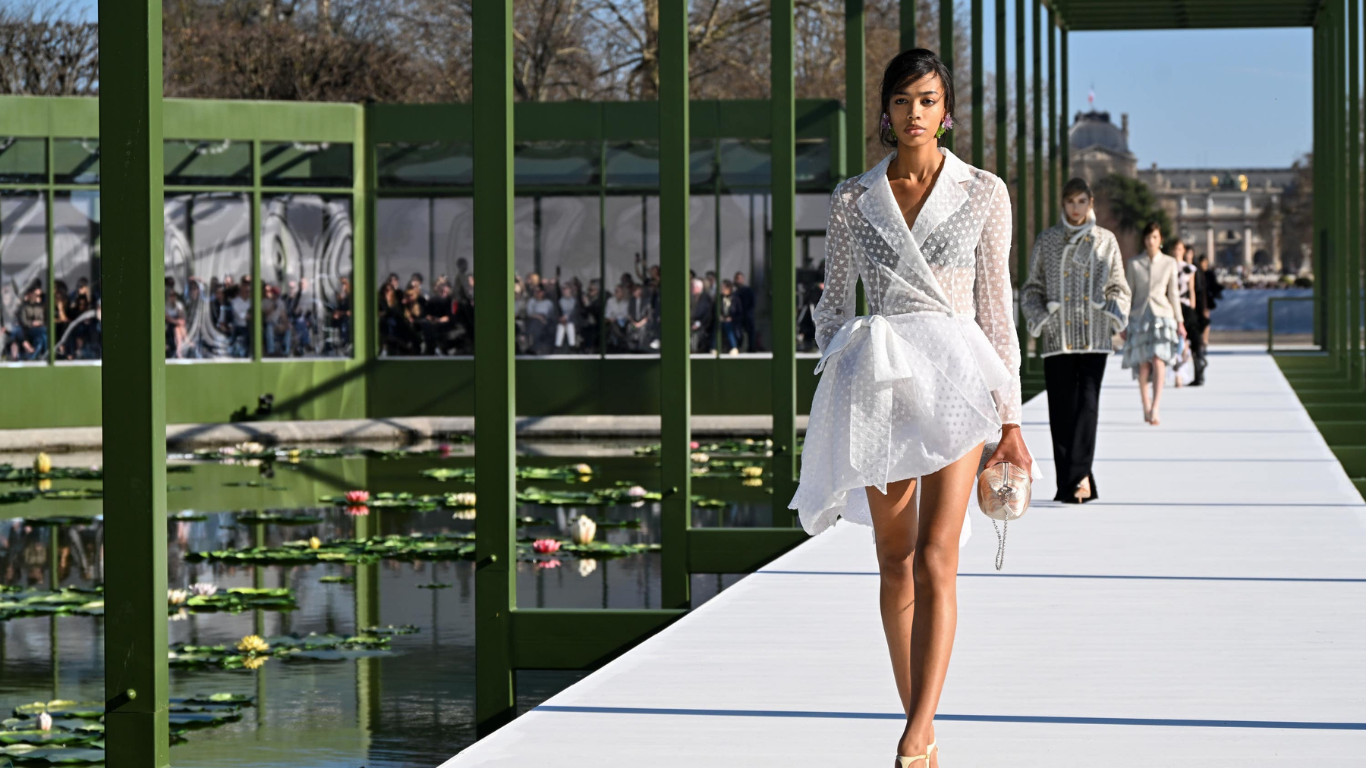 Models crossed a narrow bridge over water dotted with lilies, their reflections rippling beneath them – a fitting prelude to a collection shaped by florals and fluid structure.
