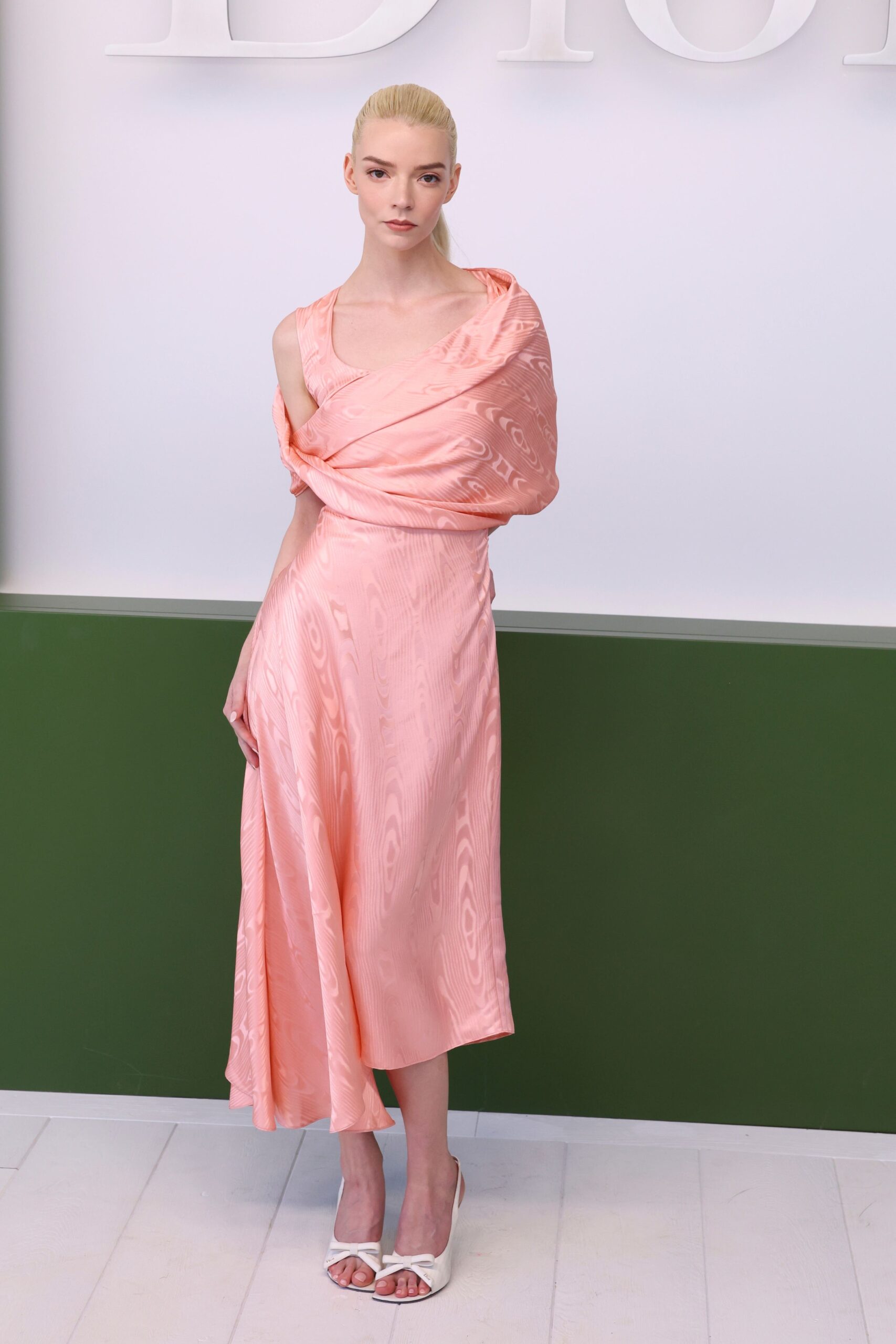Dior ambassador Anya Taylor-Joy also attended, wearing a fluid baby pink satin midi dress with a softly draped neckline and matching shawl detail, paired with white pointed heels – a delicate blush tone that is already shaping up to be one of spring’s defining colours.