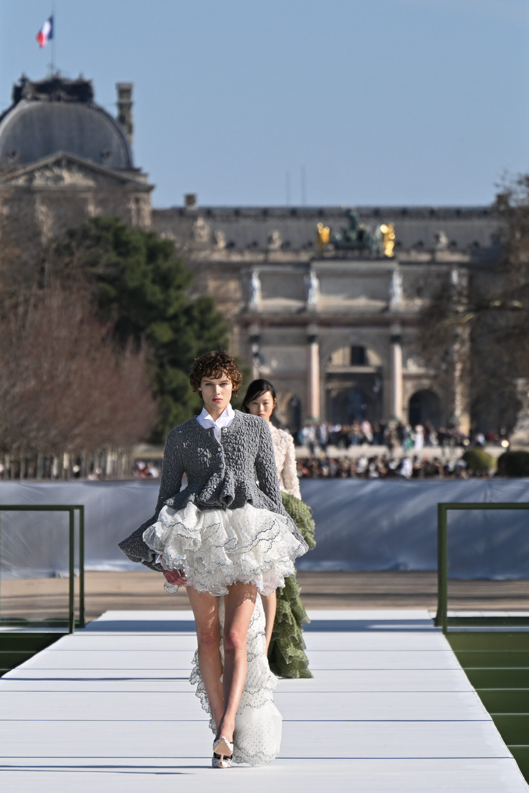 The setting amplified the message. Models moved beneath green pergolas with the Paris skyline and Eiffel Tower in the distance.