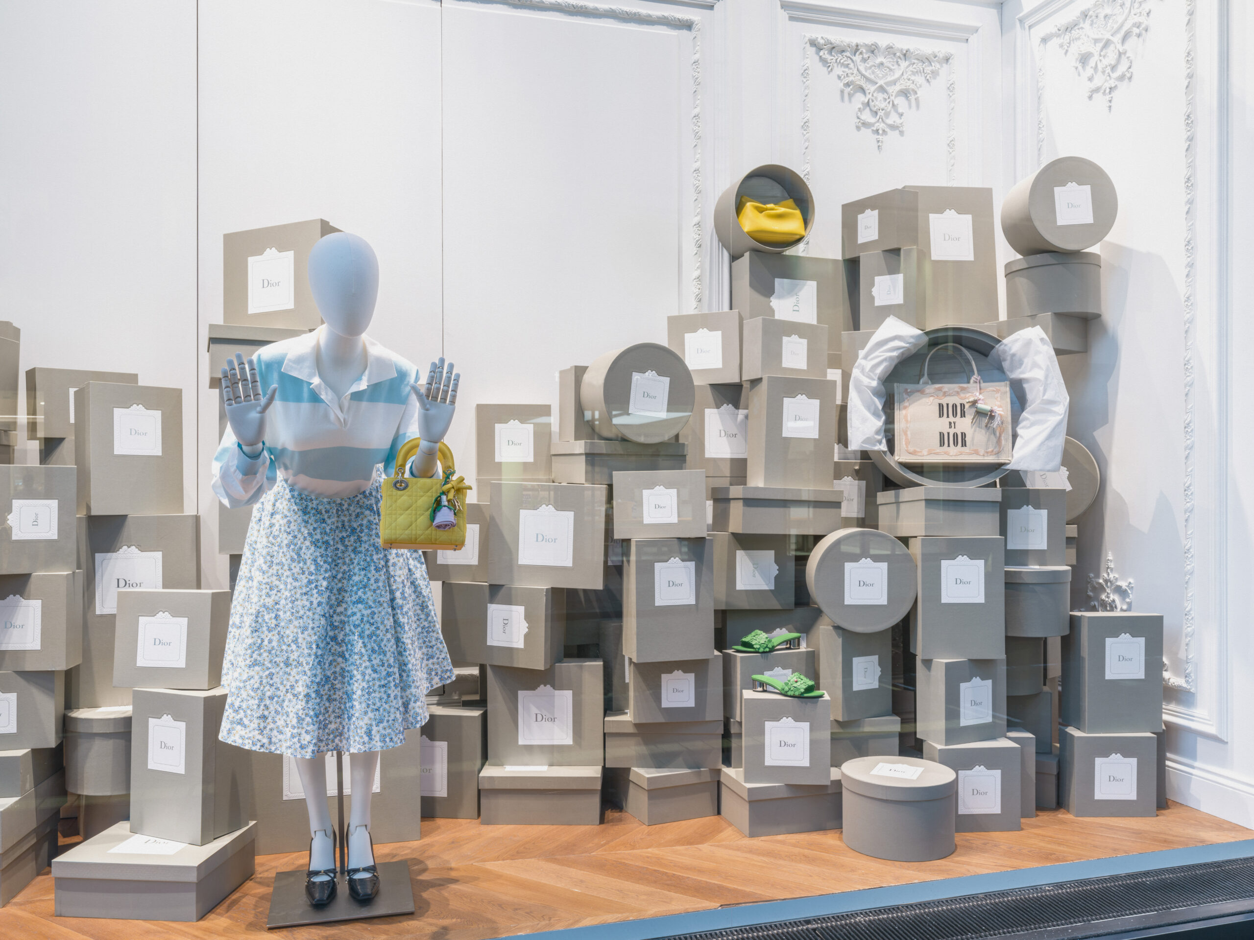 Inspired by the archives, the décor of the pop-up playfully reinterprets the Dior grey boxes from the designer house’s very first boutique, called ‘Colifichets’. Visitors are being invited to choose one of the stacked boxes with a chance to find a golden ticket inside giving them access to gifts designed by Anderson.