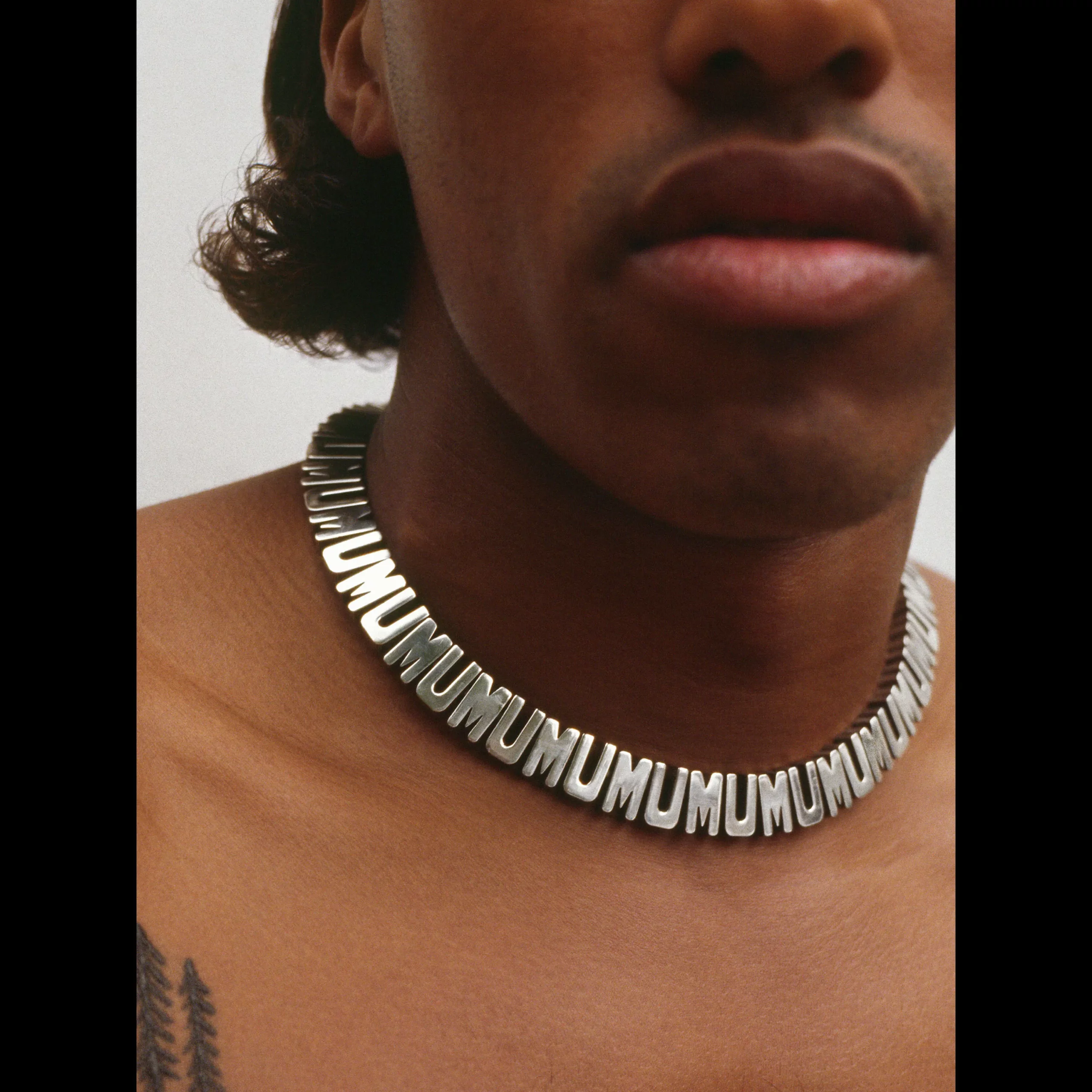 Reflective of her role outside of fashion, Philo punctuated the collection with chunky necklaces that wrap around the neck to read ‘mum’ in repeat.