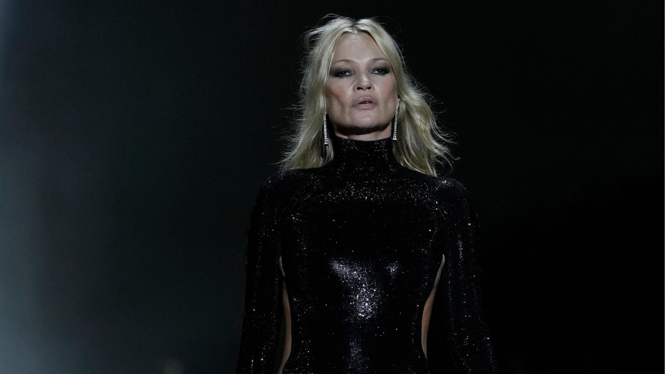 Kate Moss closed Gucci’s autumn/winter 2026 show in Milan in a floor-length black sequinned gown, its low open back revealing the unmistakable flash of a Nineties-style “whale tail” G-string – a detail that instantly transported the audience back to the house’s most provocative era.