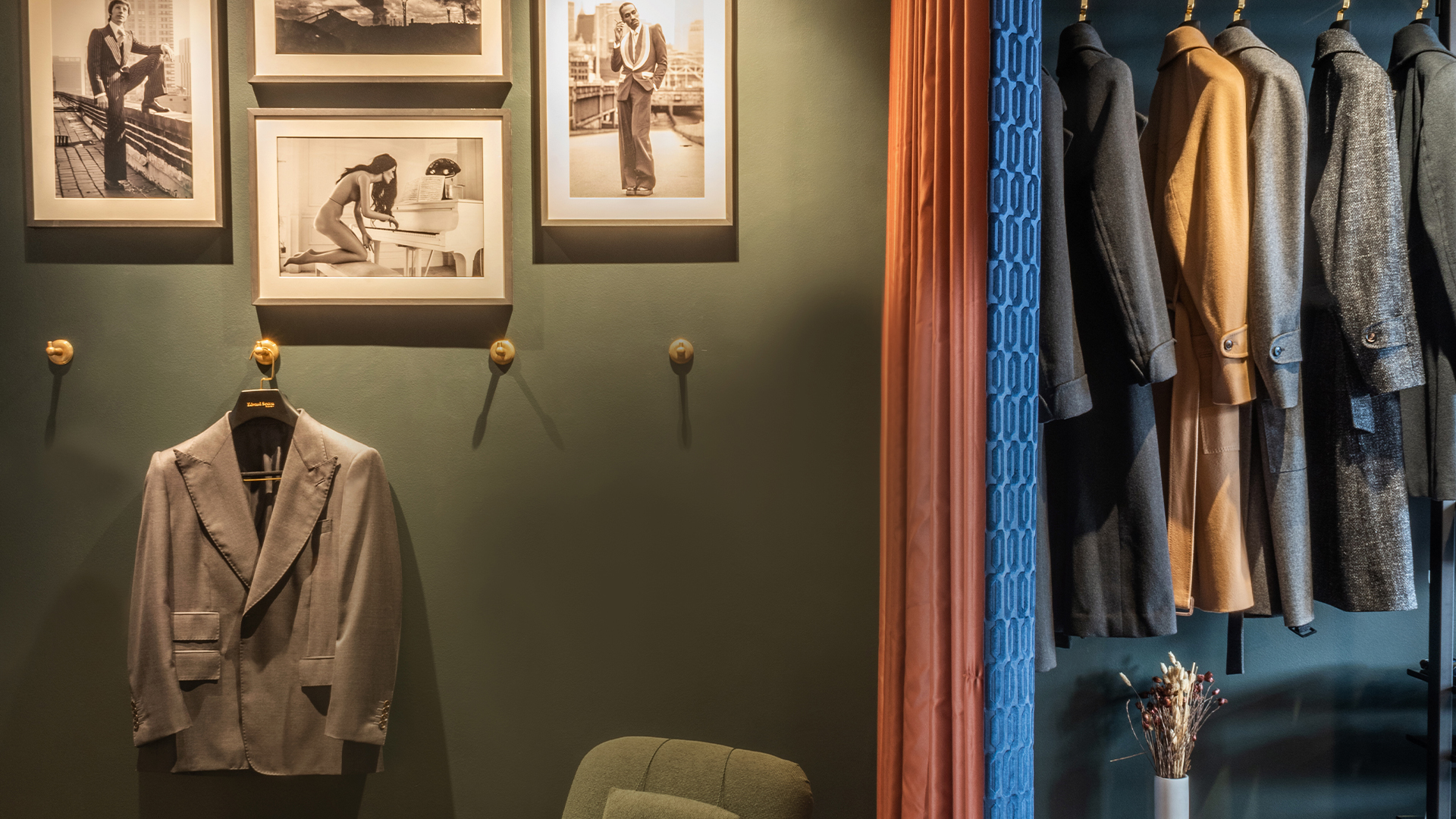 Luxurious corduroy and geometric vinyl shapes are collaged on the walls “mirroring the sharp lines and smooth textures of a Sexton suit”, while dramatic lighting shapes the space inviting customers to consider standout pieces. Artwork comes care of neighbouring gallery Carl Kostyál, based opposite the store on the second floor of 12A Savile Row.