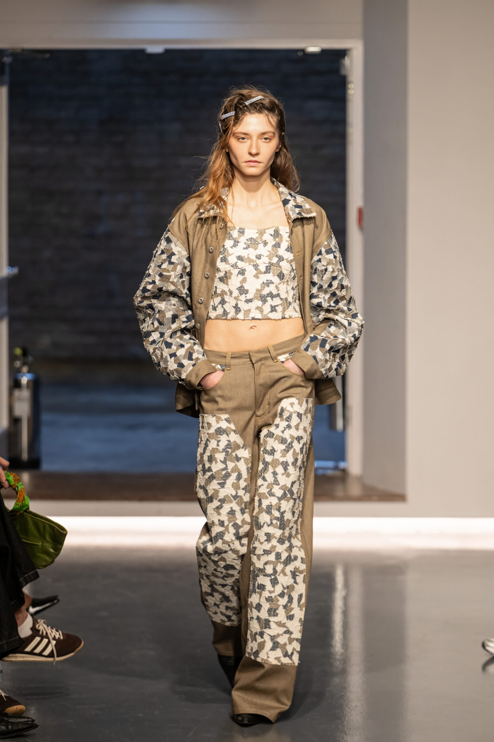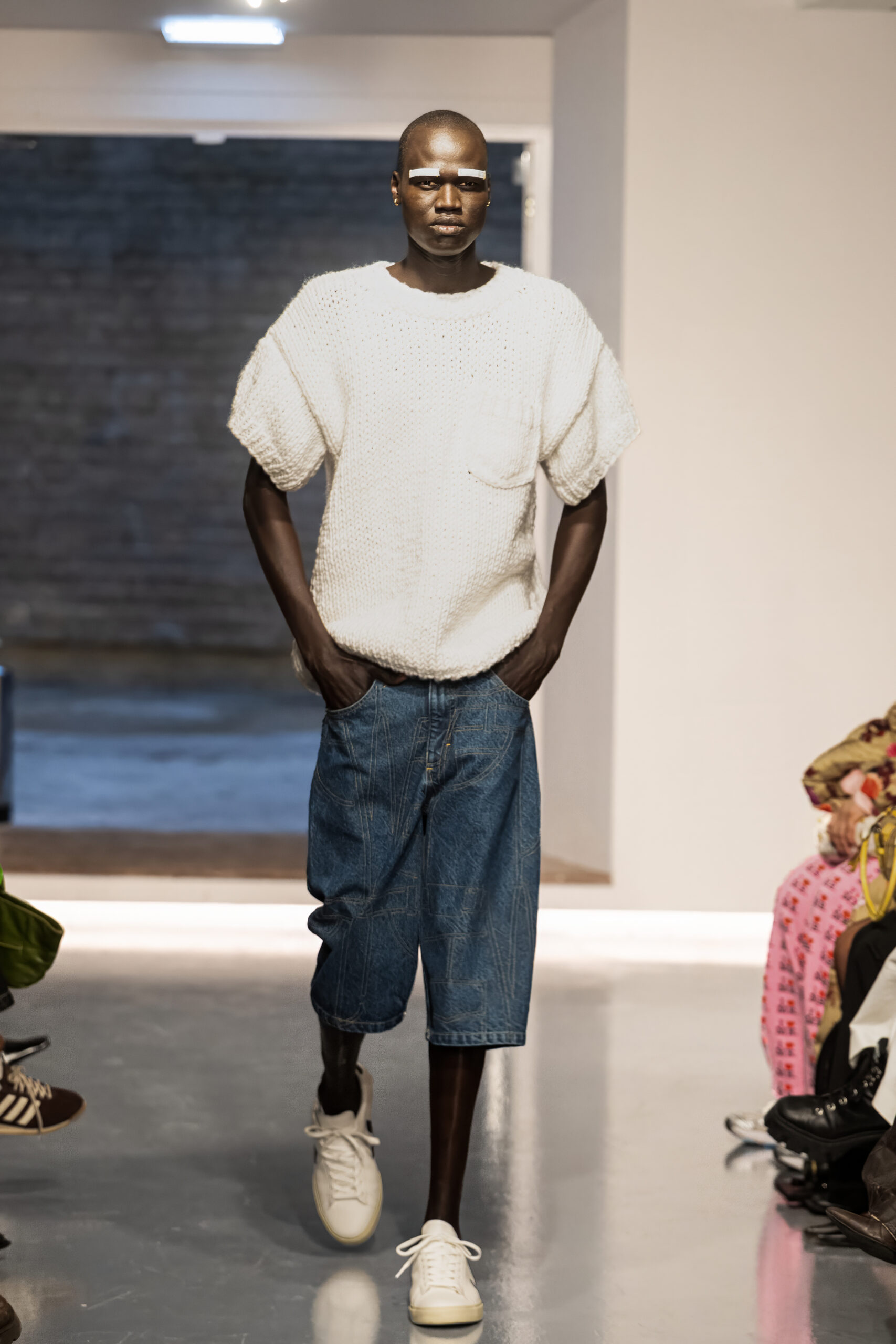During the show, denim was explored in multiple states: knitted, printed, quilted, reconstructed and displaced. Knitted jeans and jackets replicated traditional denim construction in yarn, maintaining the logic of the garment while abandoning the fabric itself.