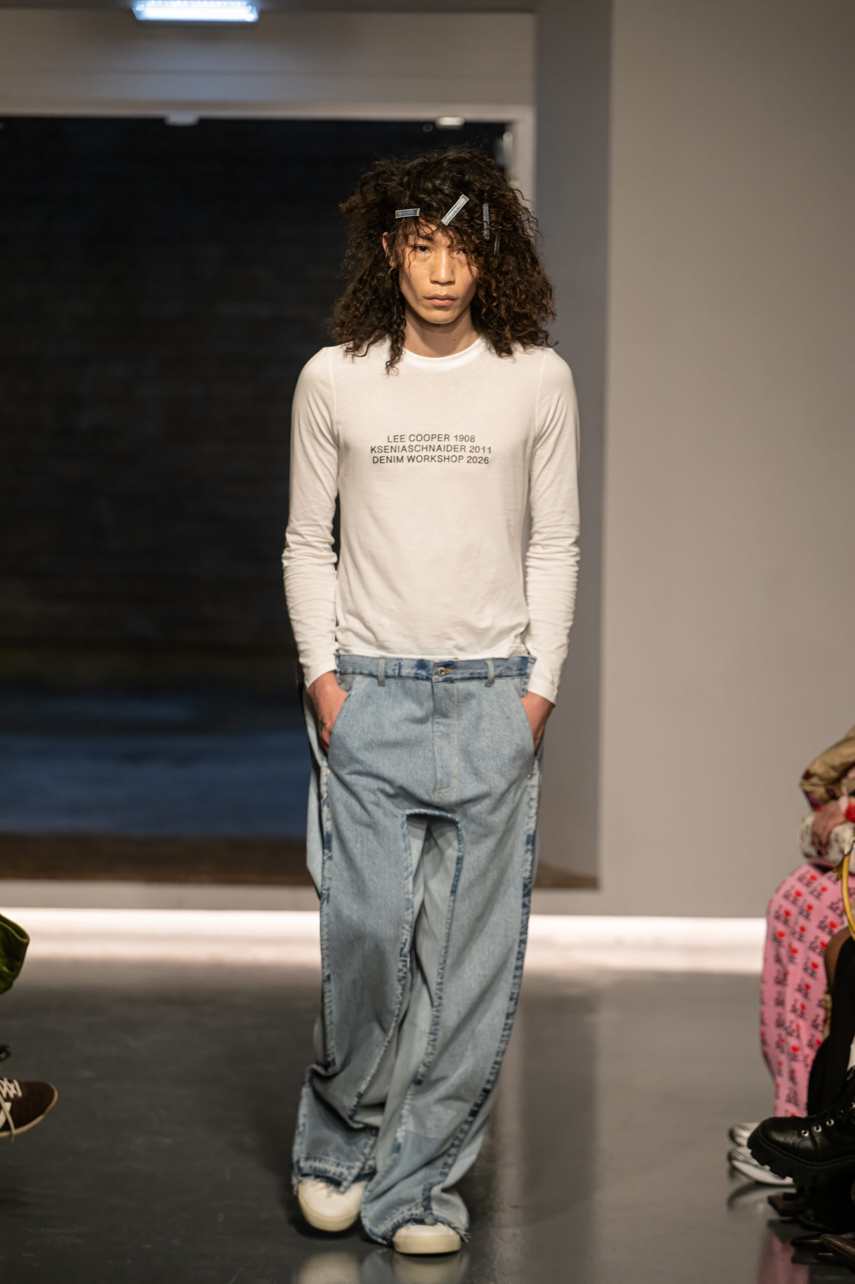 Menswear direction also returned with Multipocket constructions, extending the original Kseniaschnaider Men line by Anton Schnaider. Additionally, the second Kseniaschnaider × Lee Cooper collaboration brought together Lee Cooper’s British denim heritage with Kseniaschnaider's experimental approach, "merging archival craft with progressive manipulation".