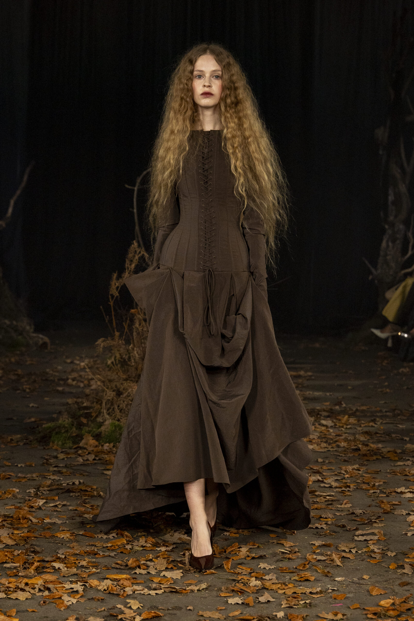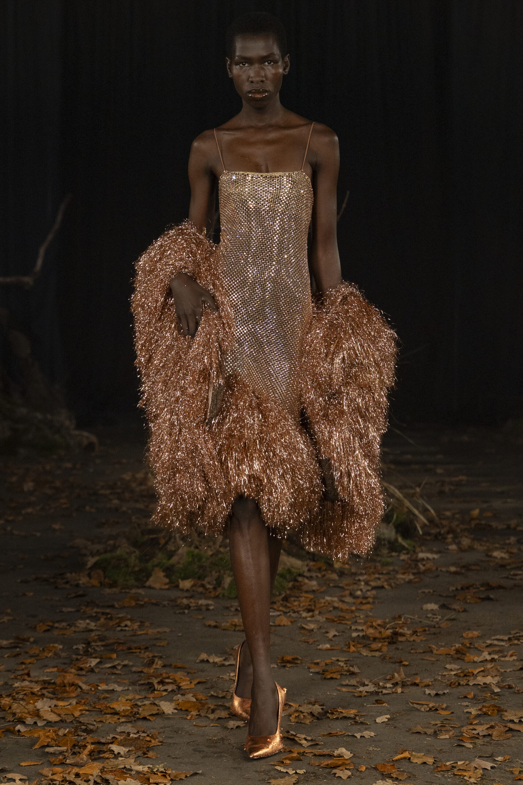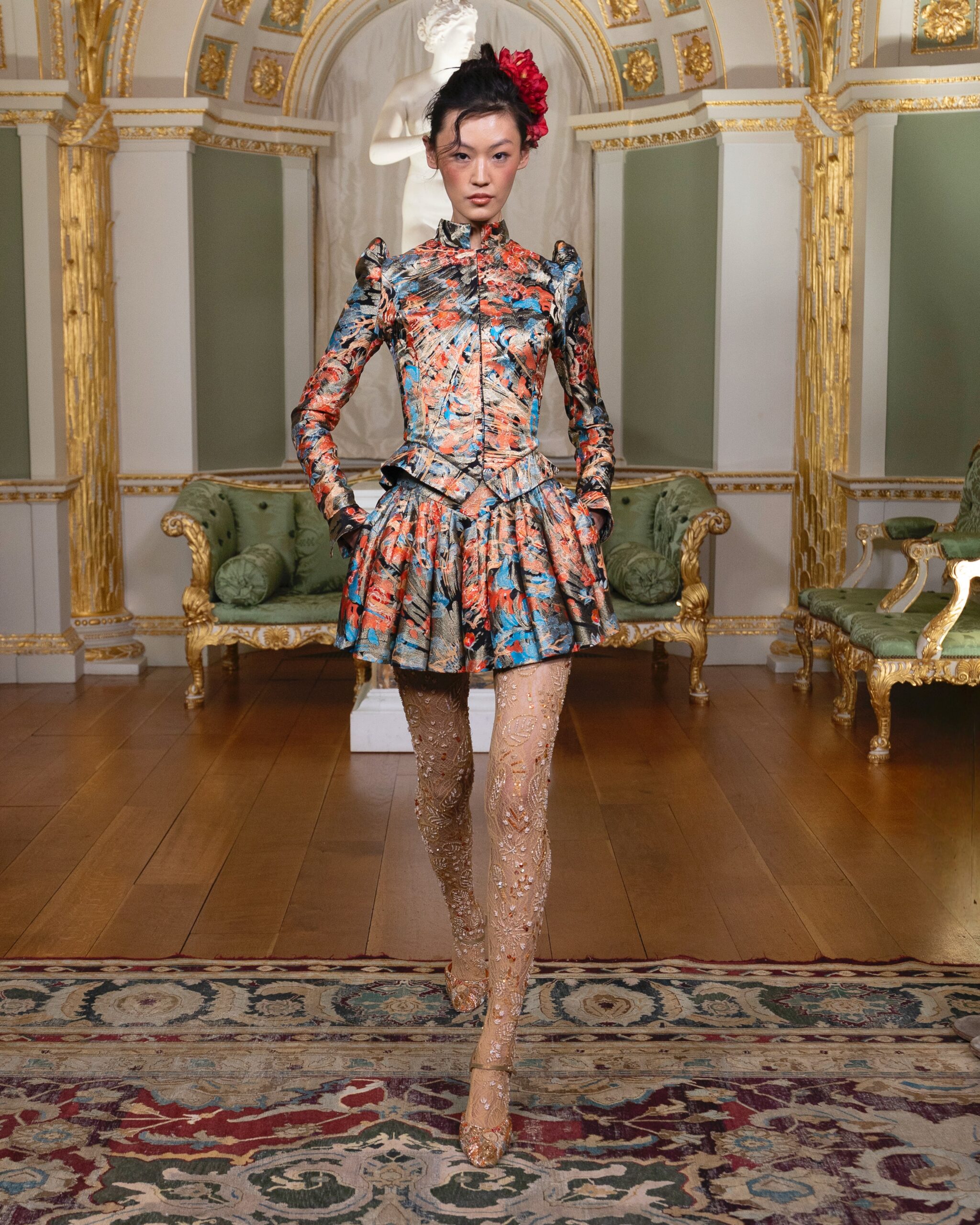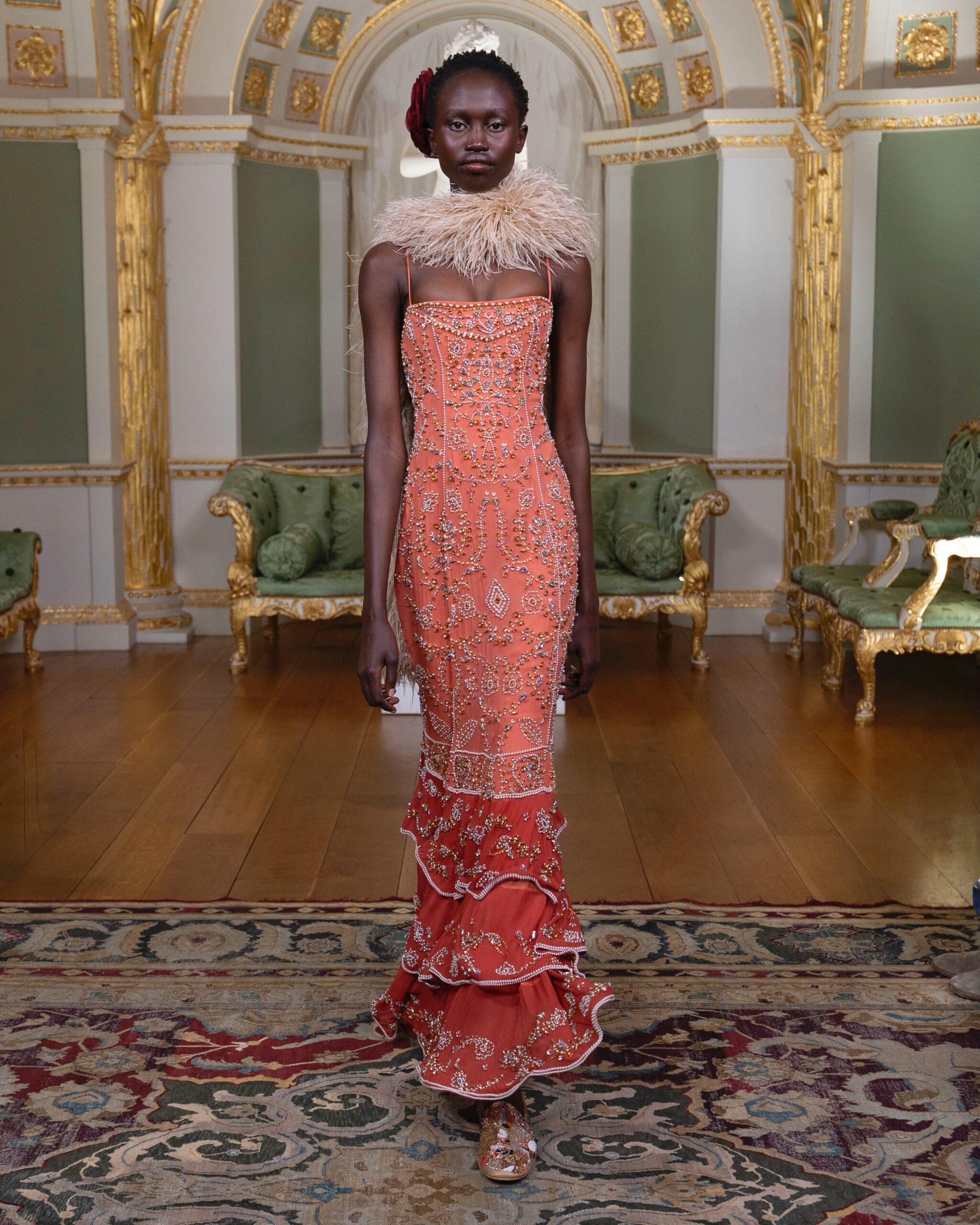 Texture played a central role. Tapestry-style florals in burnished orange, teal and gold were cut into high-necked dresses with sculpted shoulders, while metallic threads, fringe and tassels added movement, and feathers received full theatrical treatment.