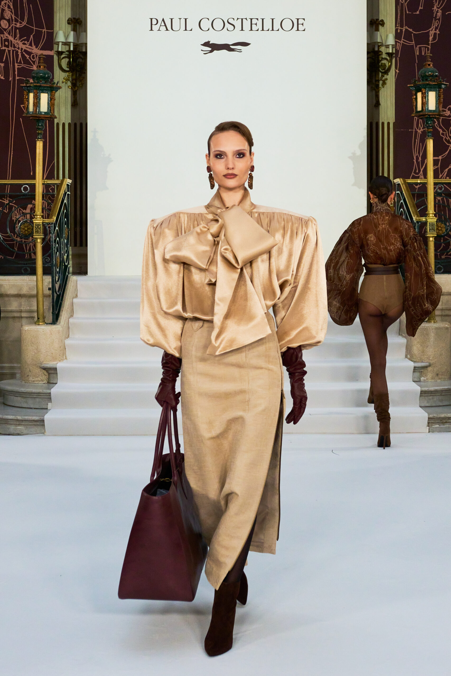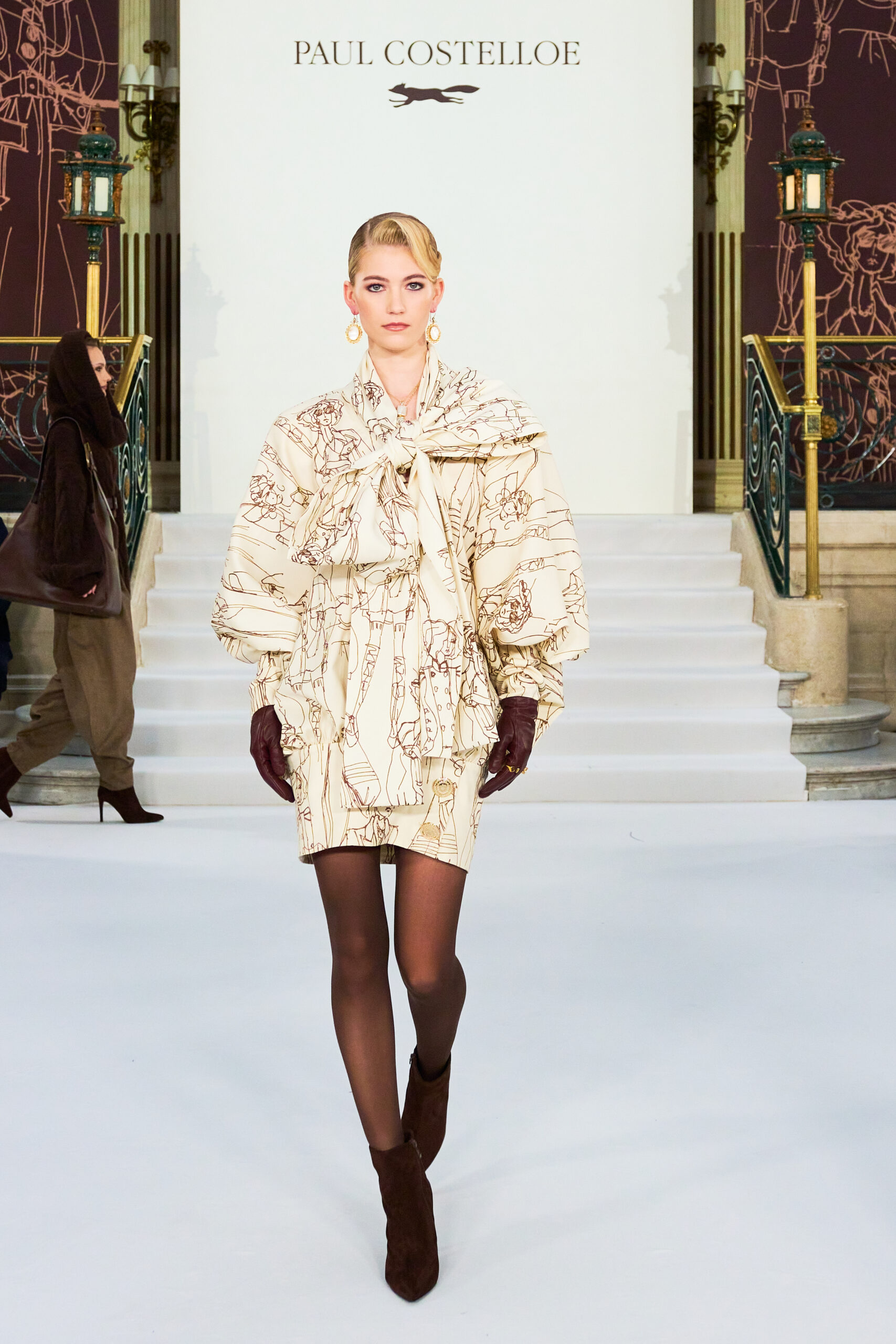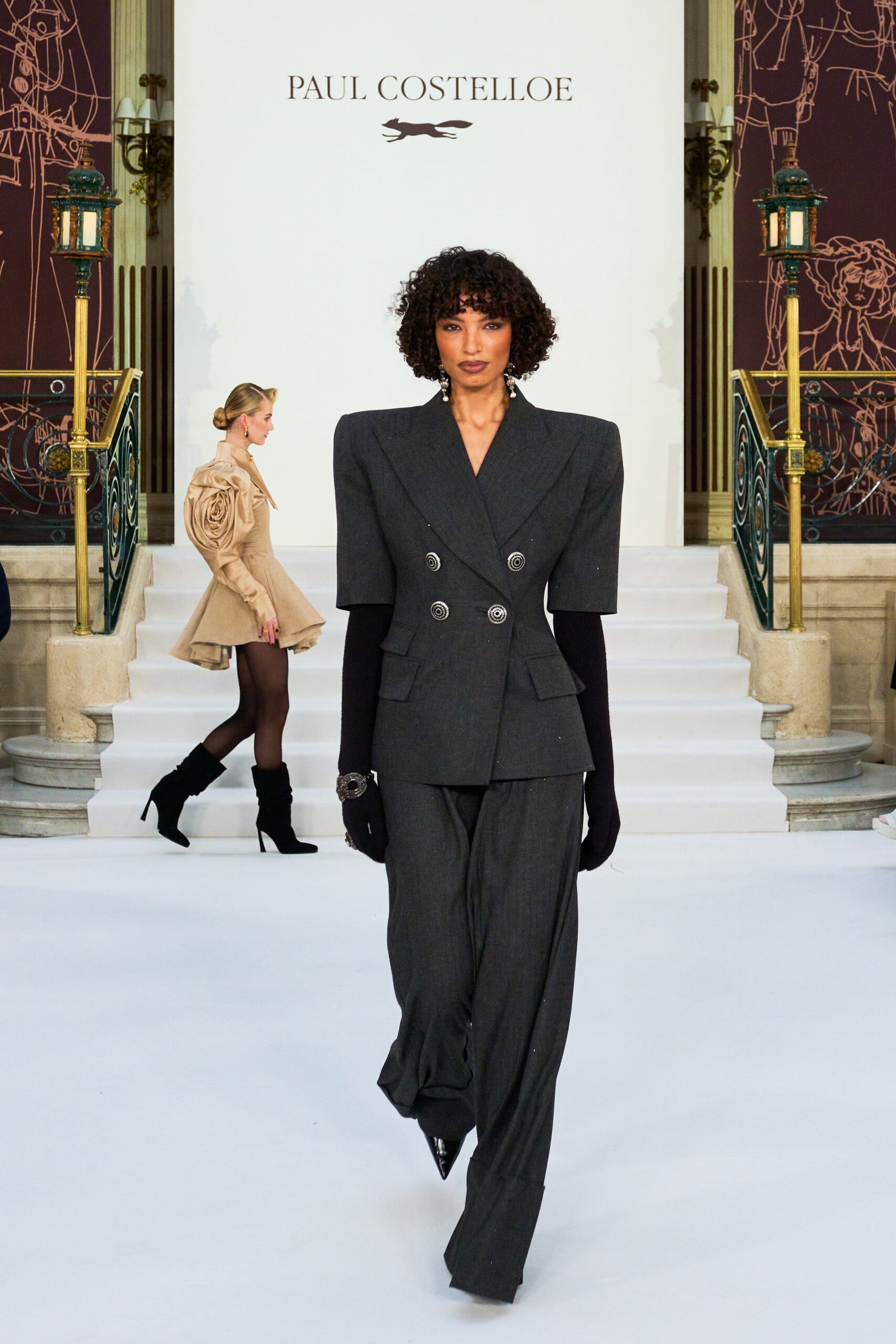 The collection leaned on a refined, restrained palette of grey, taupe, mocha and black, with silhouettes that carried historical resonance. Opera gloves and exaggerated shoulders reinforced a sense of structured opulence. Meanwhile, eveningwear featured ballgowns adorned with Paul Costelloe’s signature illustrative drawings, a subtle way of weaving the founder’s hand into this new chapter.