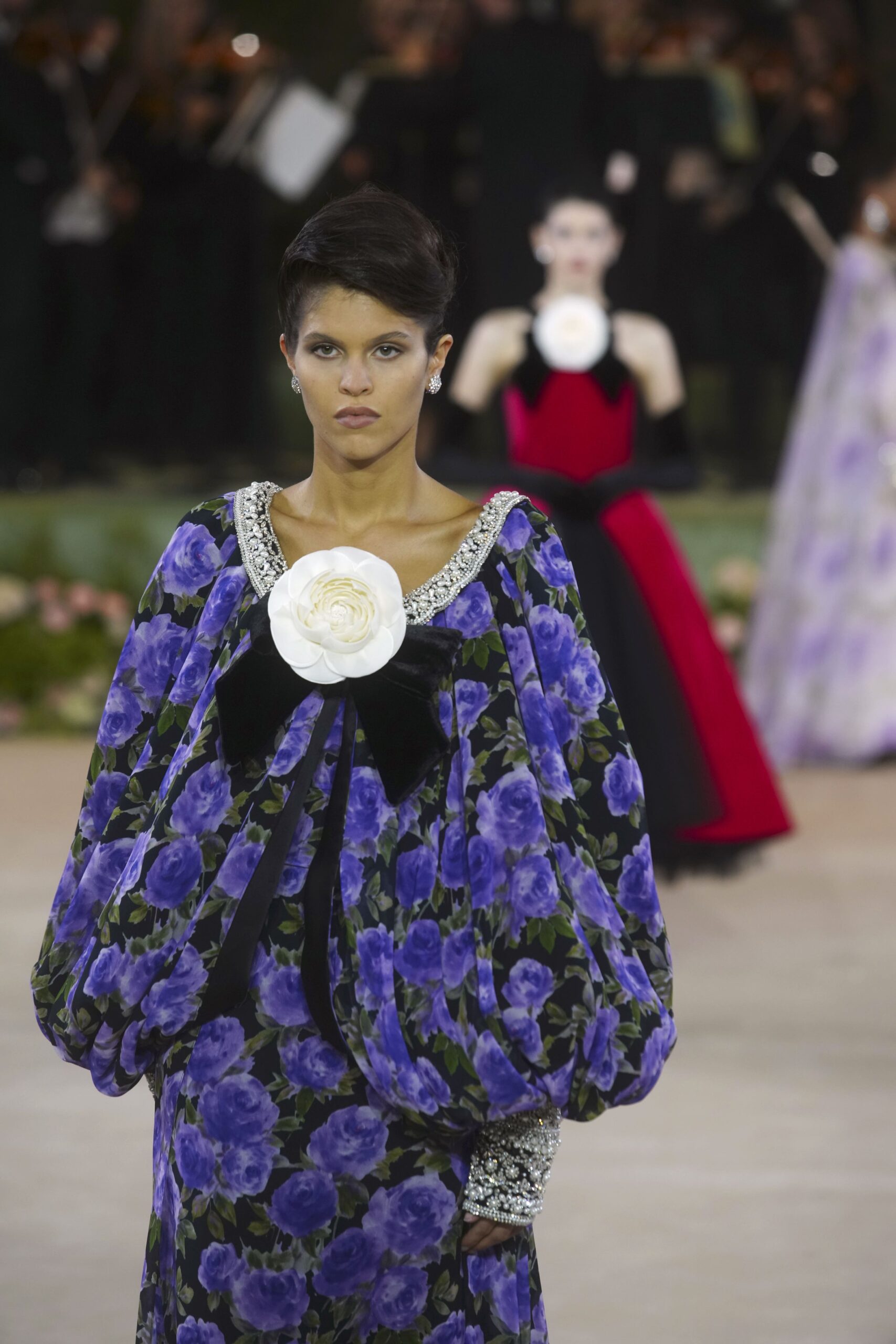 Pinned at necklines or resting at the centre of giant bows, the motif unified the show. Long black gloves added punctuation, giving many of the looks a mid-century couture frame.