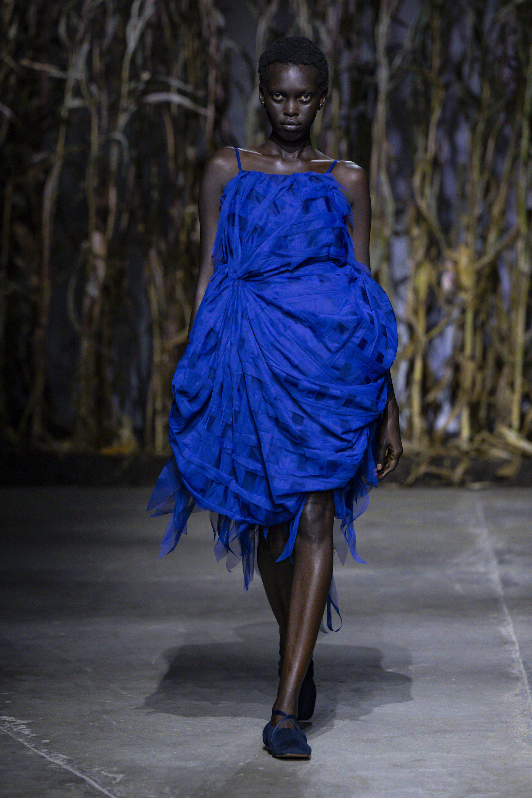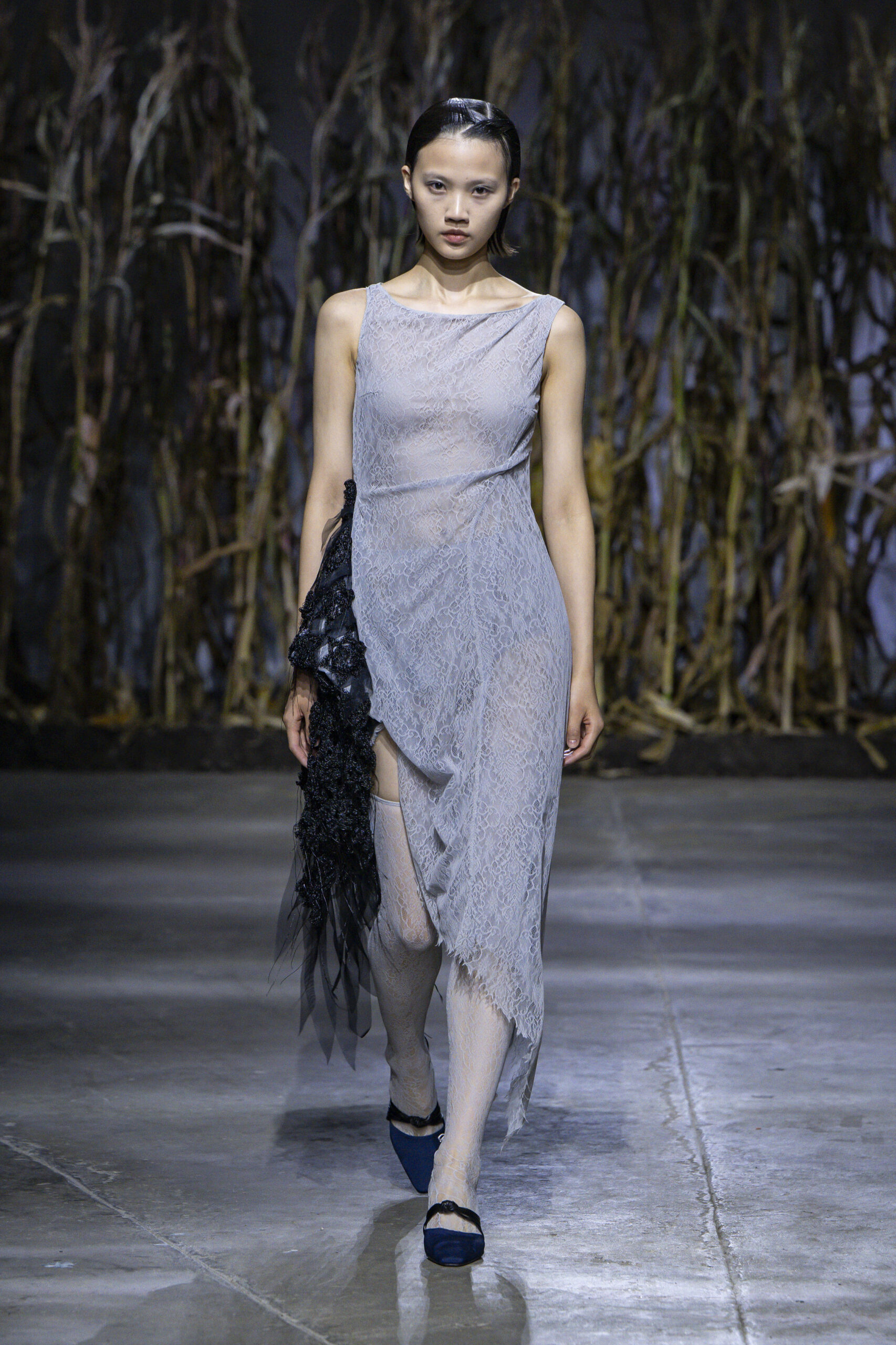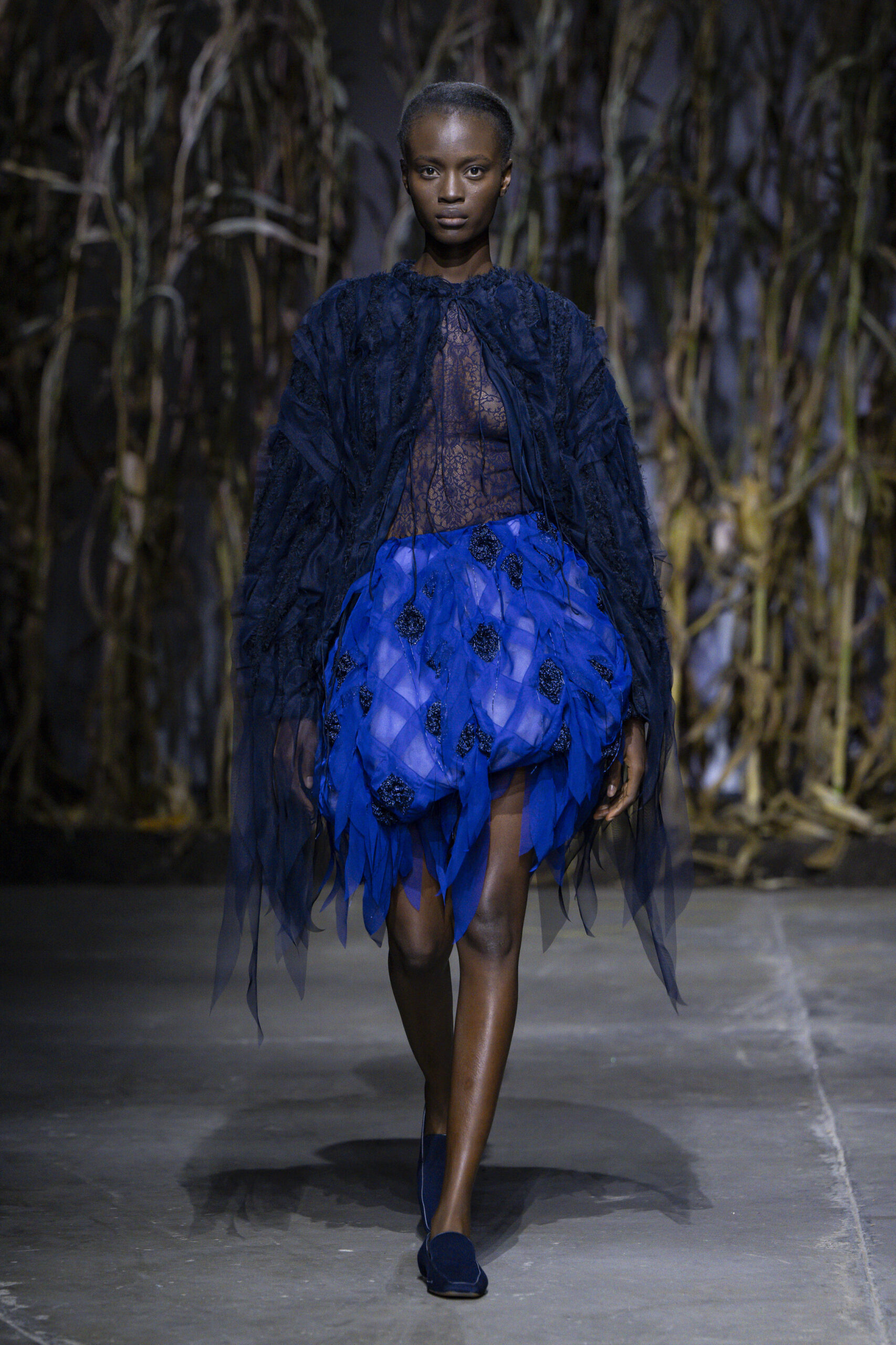 The colour palette moved from blacks to blues to whites, with these shades doubling back on themselves - grief may never be linear, of course. A highlight was an intricate rose, thread-like choker that crept around a model’s neck and arms - it’s stunning sensitivity and precision an obvious metaphor the exquisite pain of losing a loved one.