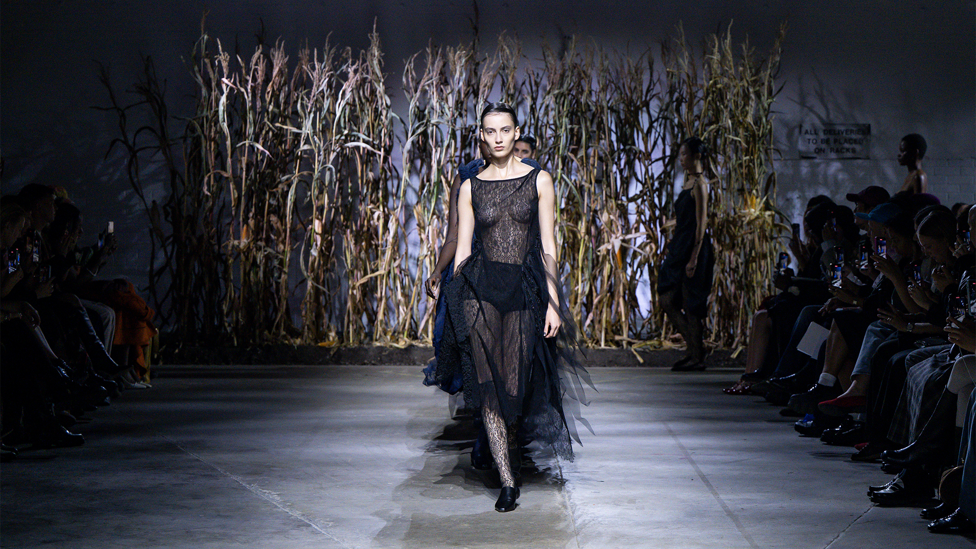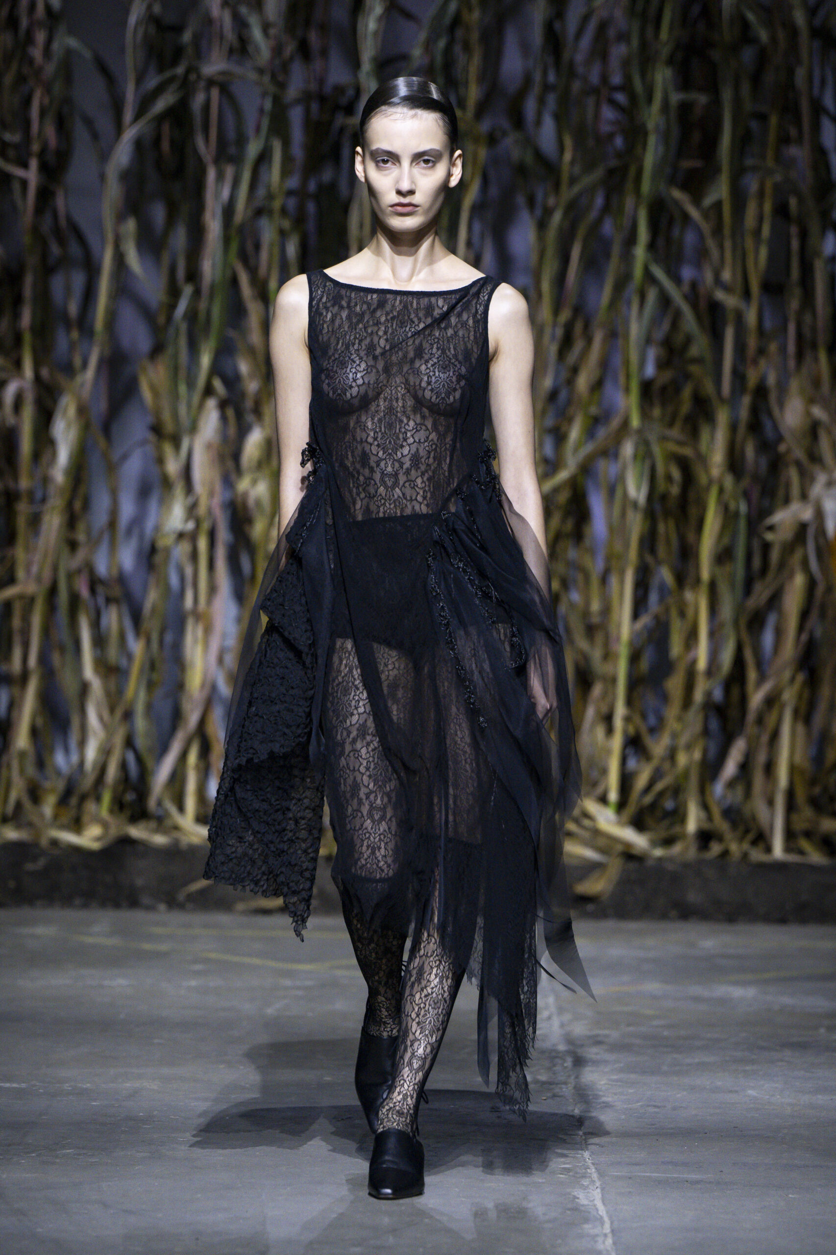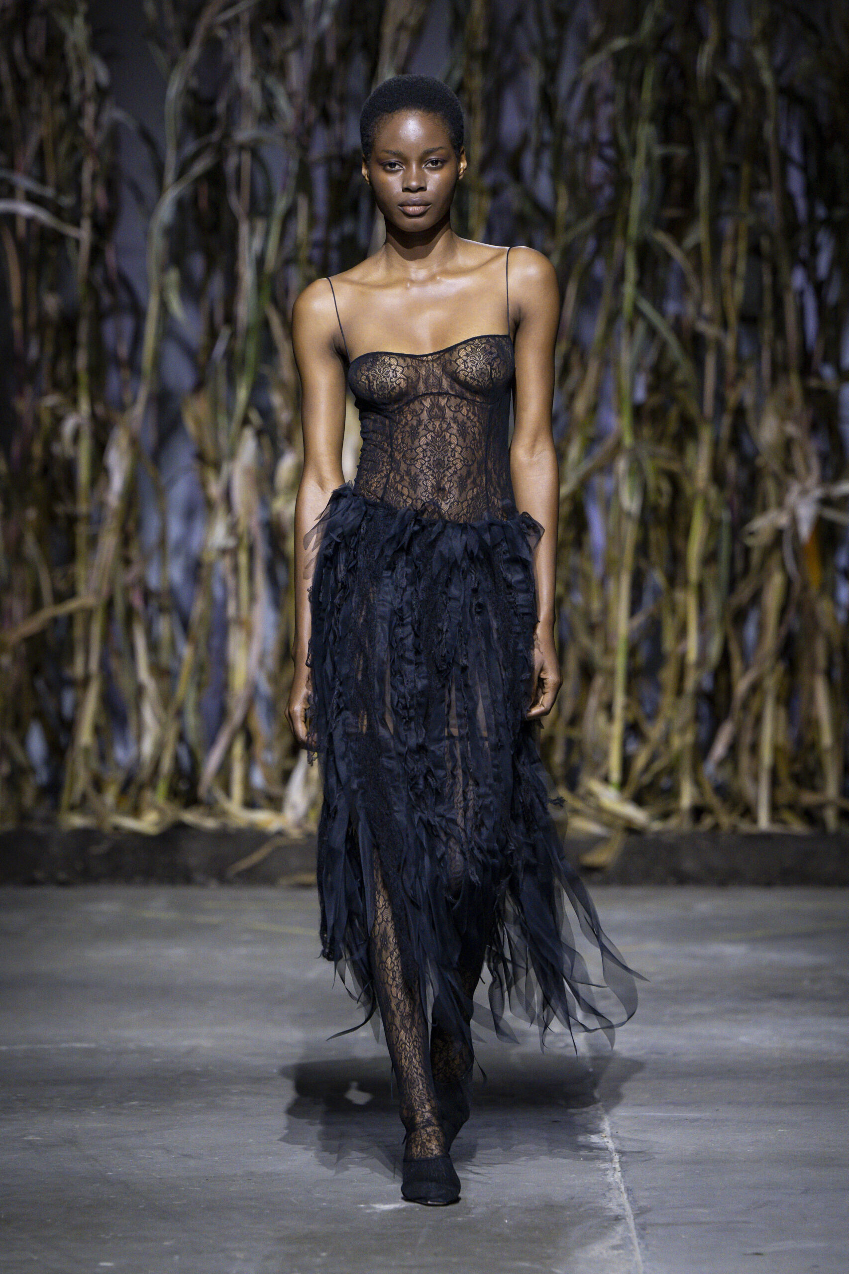 The collection began with a sheer white lace dress with a rose appliqué at the hip holding the hint of a train. It was followed by the same dress in black - a stark juxtaposition that jolted the reality of death to the forefront of our minds. The model's exposed chest spoke volumes about the vulnerability on show- we had a front-row seat to Dujancourt’s pained remembrance of these moments.