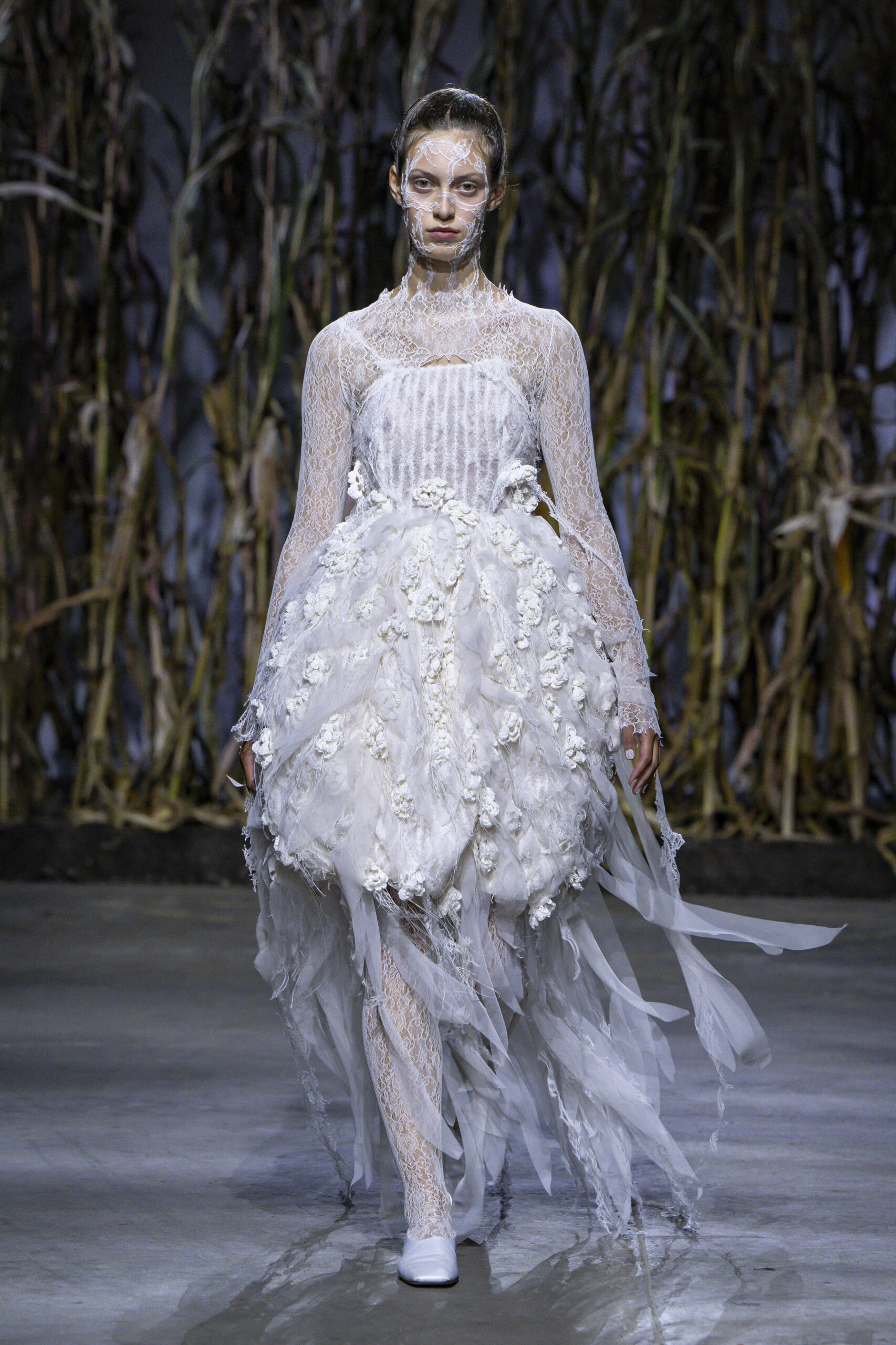In the second half, things did indeed become lighter: white and cream argyle knits were draped over taffeta skirts, striking a balance between distress and composure. The finale, the ‘Mother’s Dress’, perhaps symbolised Nina herself, who sums up her narrative with a simple yet violently accurate truth on grief: ‘Life doesn’t hurt so much anymore’. The white dress, which incorporated all the technical elements of the previous garments, moved fluidly and yet remained structured, with roses forming a geometric cross hatching over skirt.