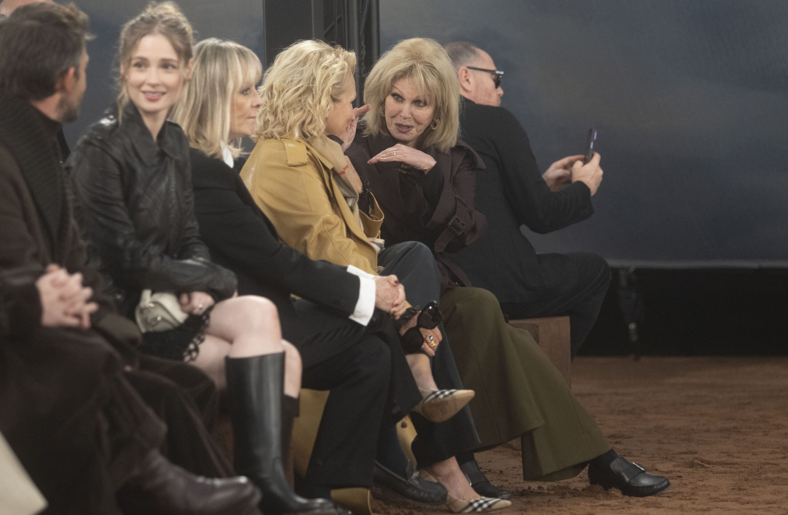 Hannah Dodd, Twiggy, Jennifer Saunders and Joanna Lumley on the front row of Burberry’s SS26 show (Jeff Moore/PA)