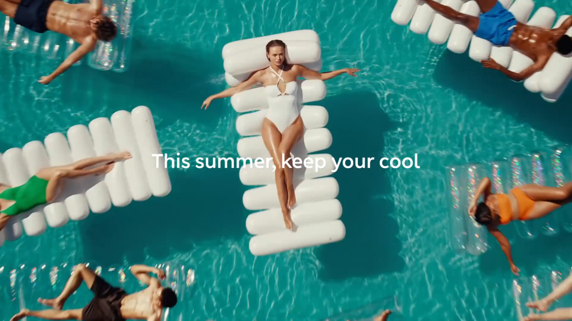 Set against a series of sunny holiday scenes the rest of the cast look effortlessly cool wearing pieces from M&S’ summer collection comprising summer co-ords, sequin embellished skirts and dresses "for pool-to-evening glam", as well as linen tailoring and swimwear in eye-catching fabrics, colourways and silhouettes. All while pumping up giant inflatables without breaking a sweat. The tag line is 'this summer, keep your cool'.