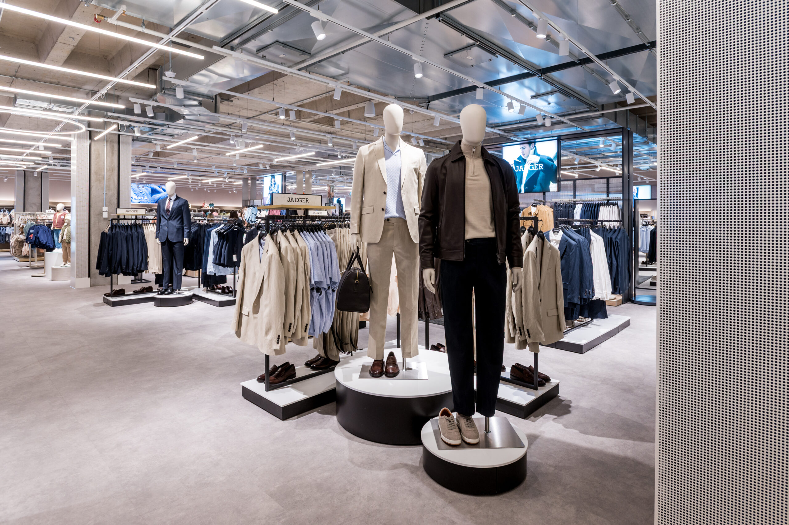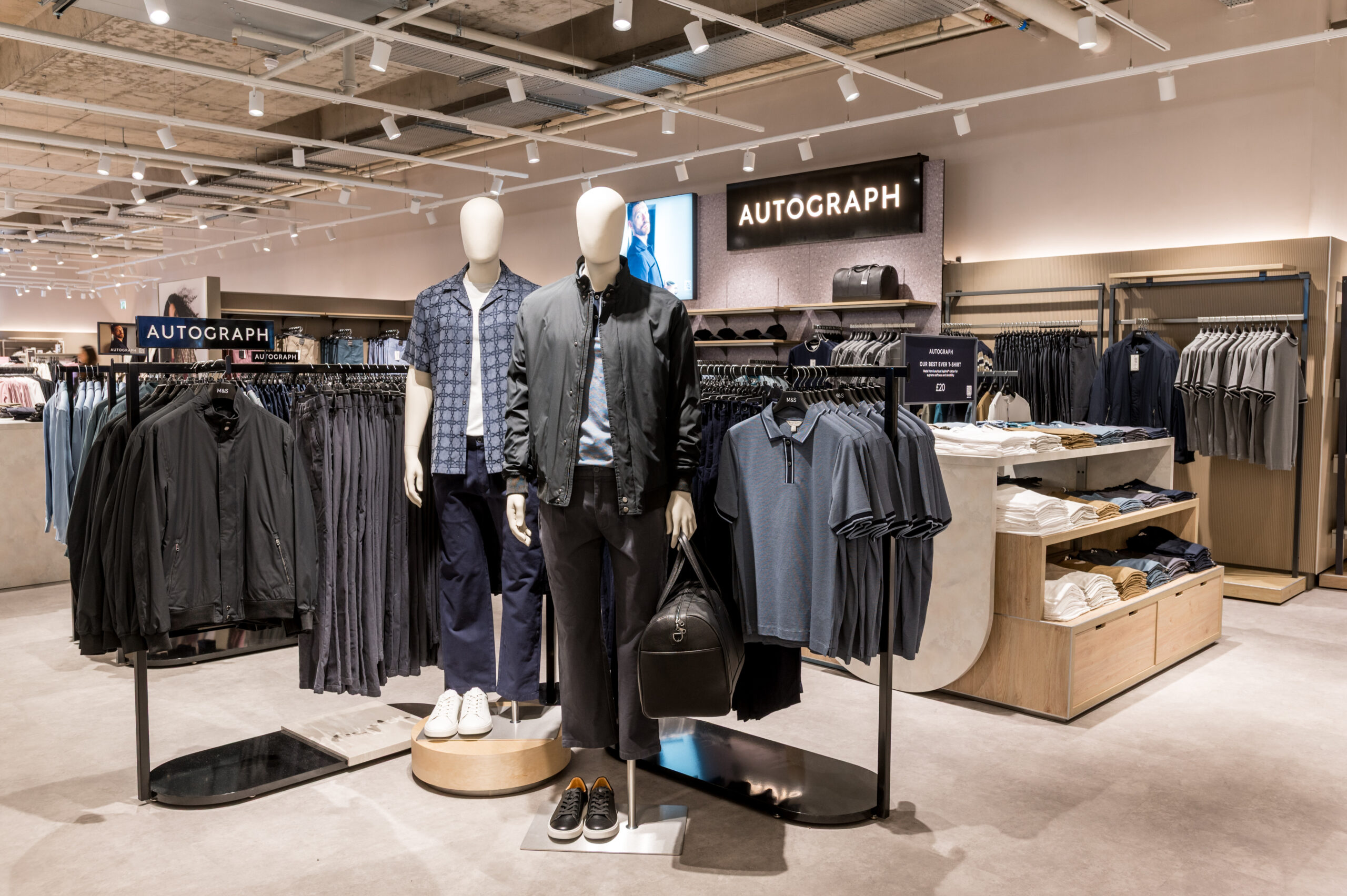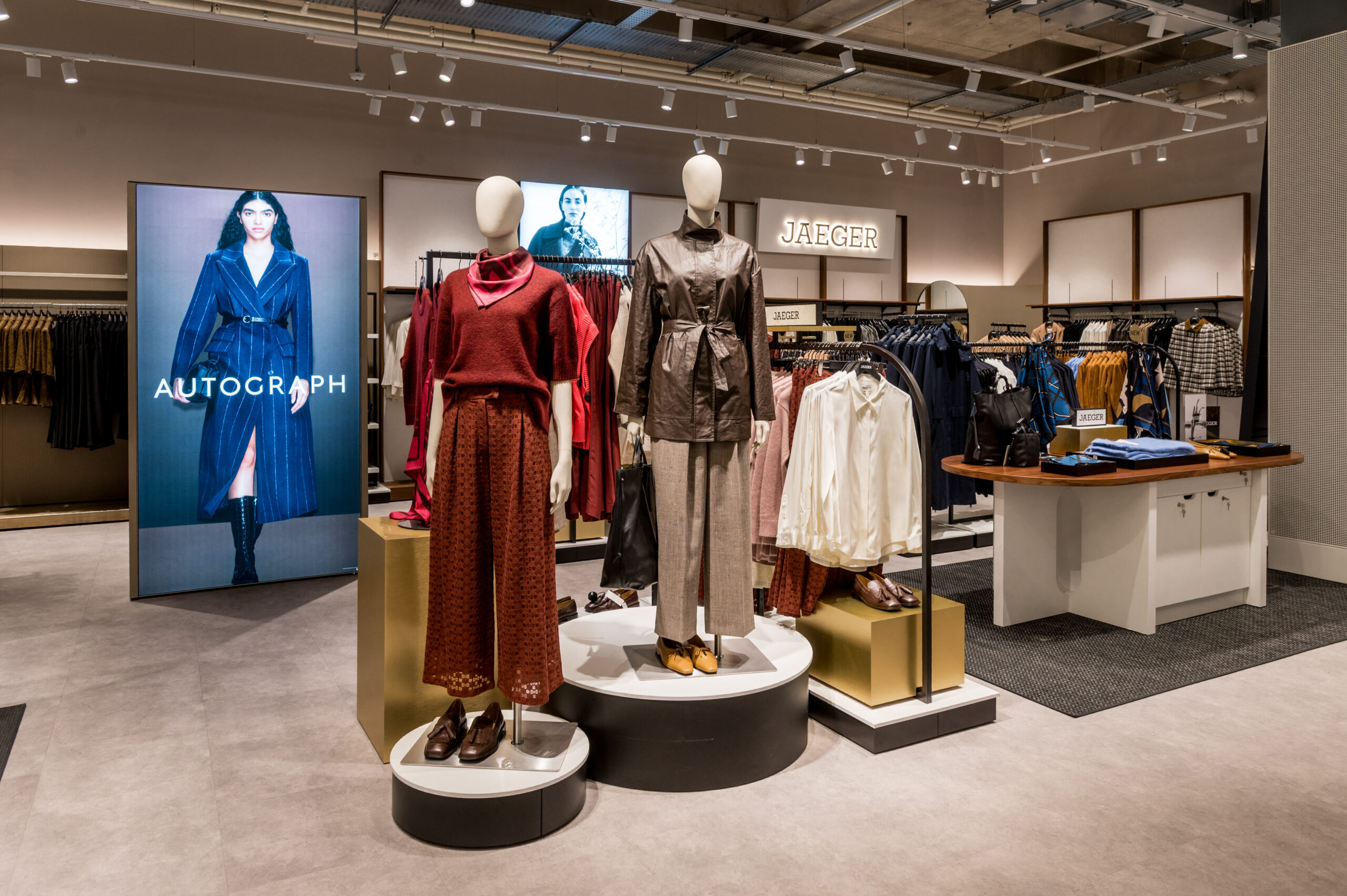 Fashion is spread across three floors, showcasing the latest collections, including Autograph womenswear and Jaeger menswear, with Click & Collect available on the first floor.
