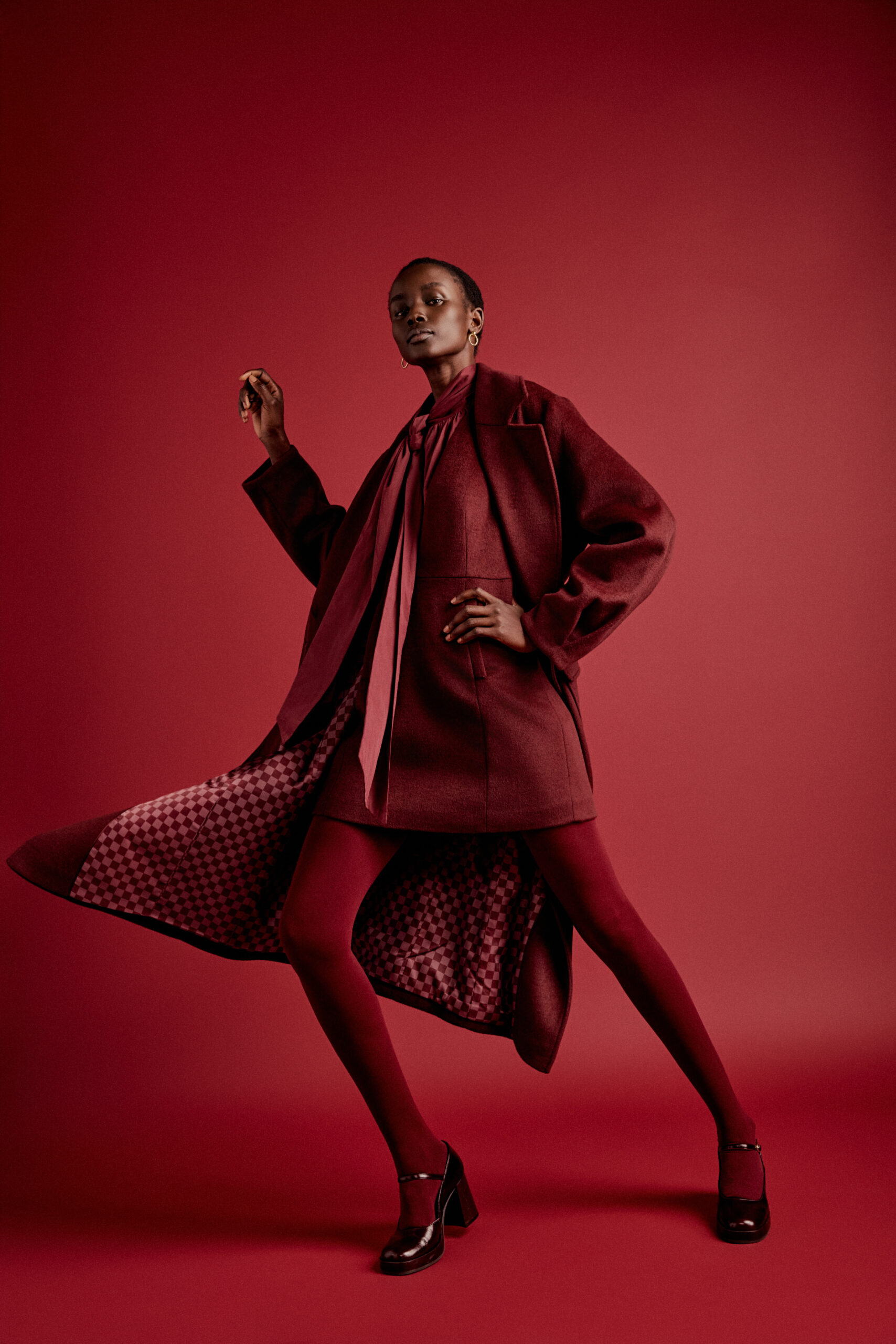 Outerwear takes “a luxe turn” with the ‘Cameron’ coat, crafted in double-faced wool and styled in an oversized cocoon shape, finished with darted cuffs for added volume.