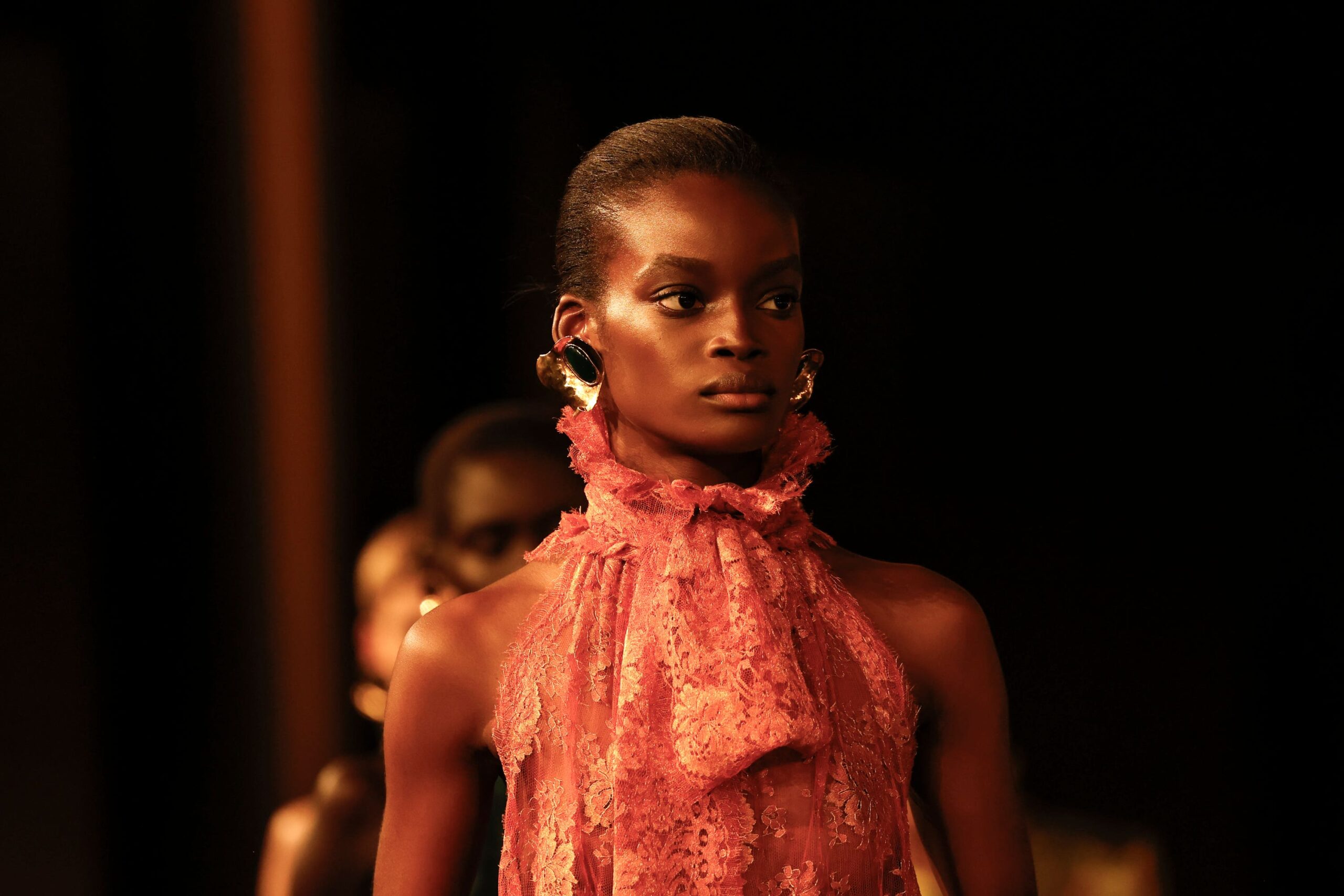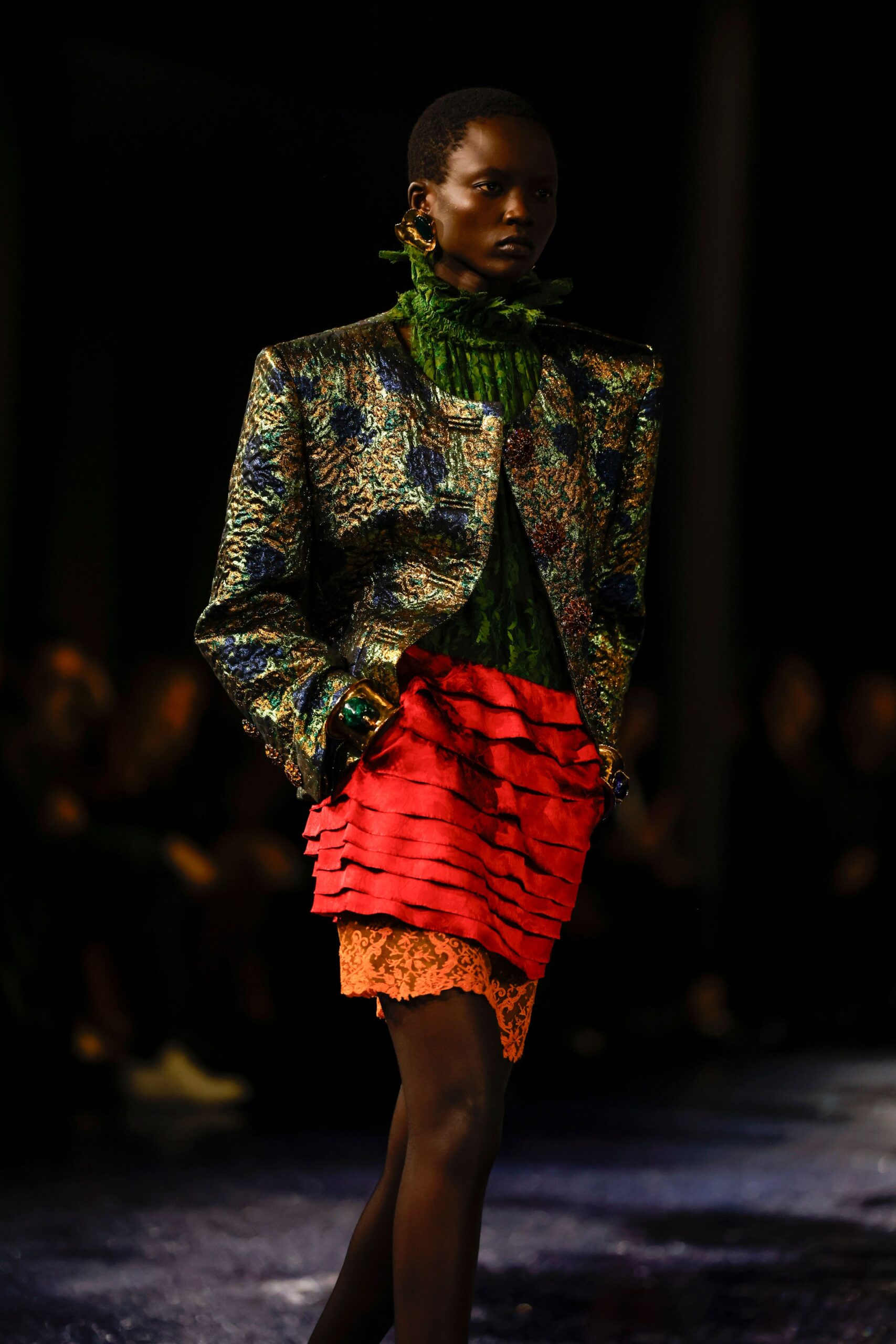 Known for reinventing the brand since taking over in 2016, Vaccarello managed to deliver a masterclass in quiet luxury with maximalist accents. Following last year’s muted utilitarian theme, this collection changed tack, showcasing sharp and tailored power suits alongside flamboyant brocade broad-shouldered jackets.