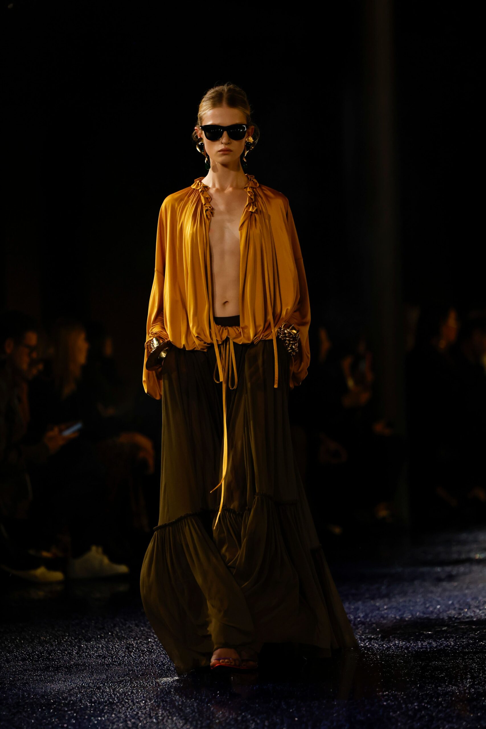 Even the more relaxed pieces in the collection, like pyjama-inspired tunics and fluid trousers, were elevated with luxurious fabrics and dazzling accessories, paying homage to Saint Laurent’s long-standing connection with Bohemian high society, artistic circles.
