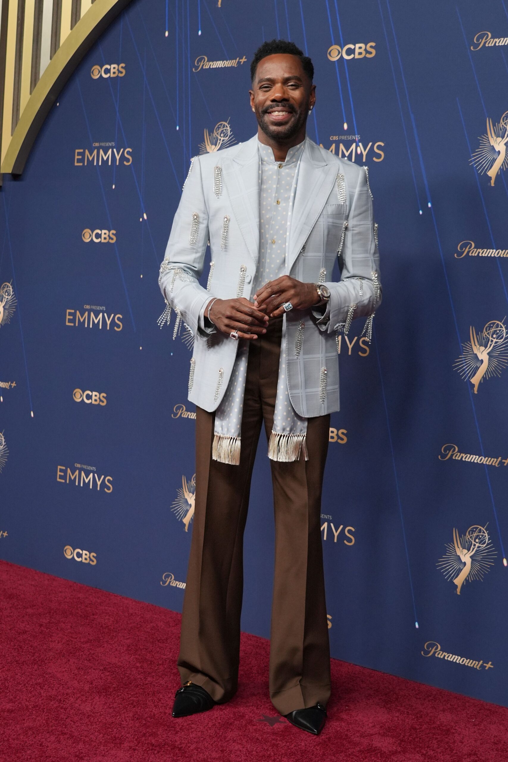 His brown flared trousers added a vintage touch, while the suit jacket dazzled with dripping silver diamantes that echoed the tassels of his dress scarf. Domingo embraced the glitz fully, accessorising with bold rings and a watch from Boucheron.