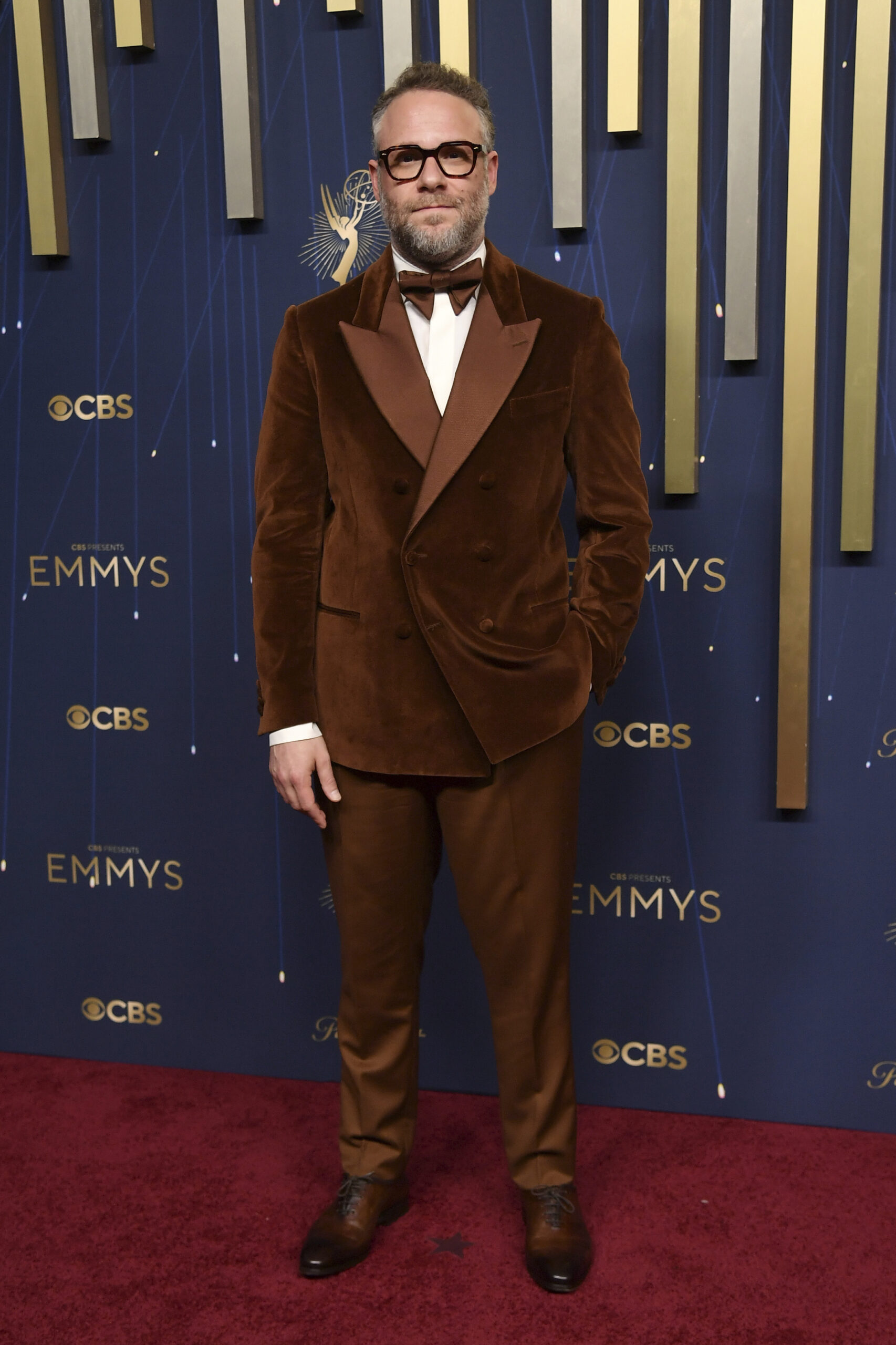 Meanwhile, Rogen made a stylish entrance in a tobacco-brown velvet tuxedo by Etro. He completed the autumnal look with a matching silk bow tie, a crisp white shirt, and thick-framed hexagonal glasses. The 43-year-old actor took home the Emmy for Best Actor in a Comedy Series for his work in The Studio.