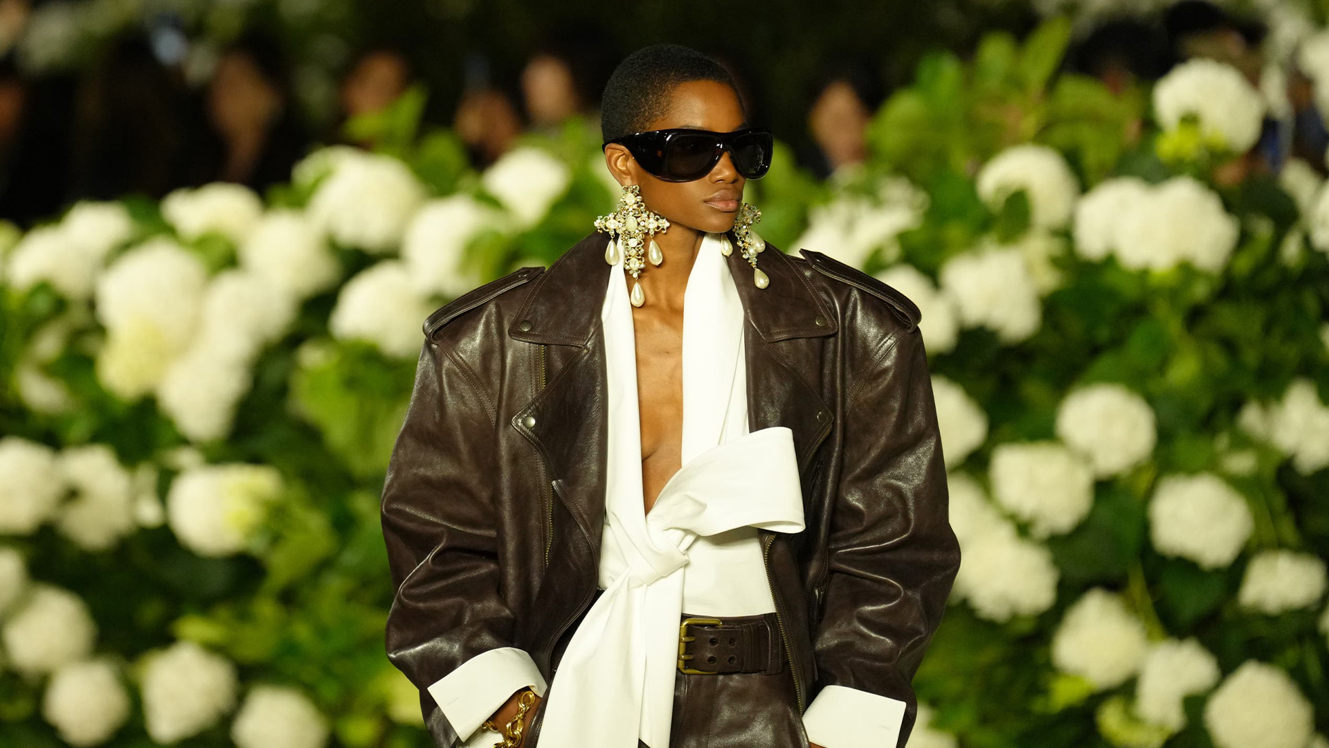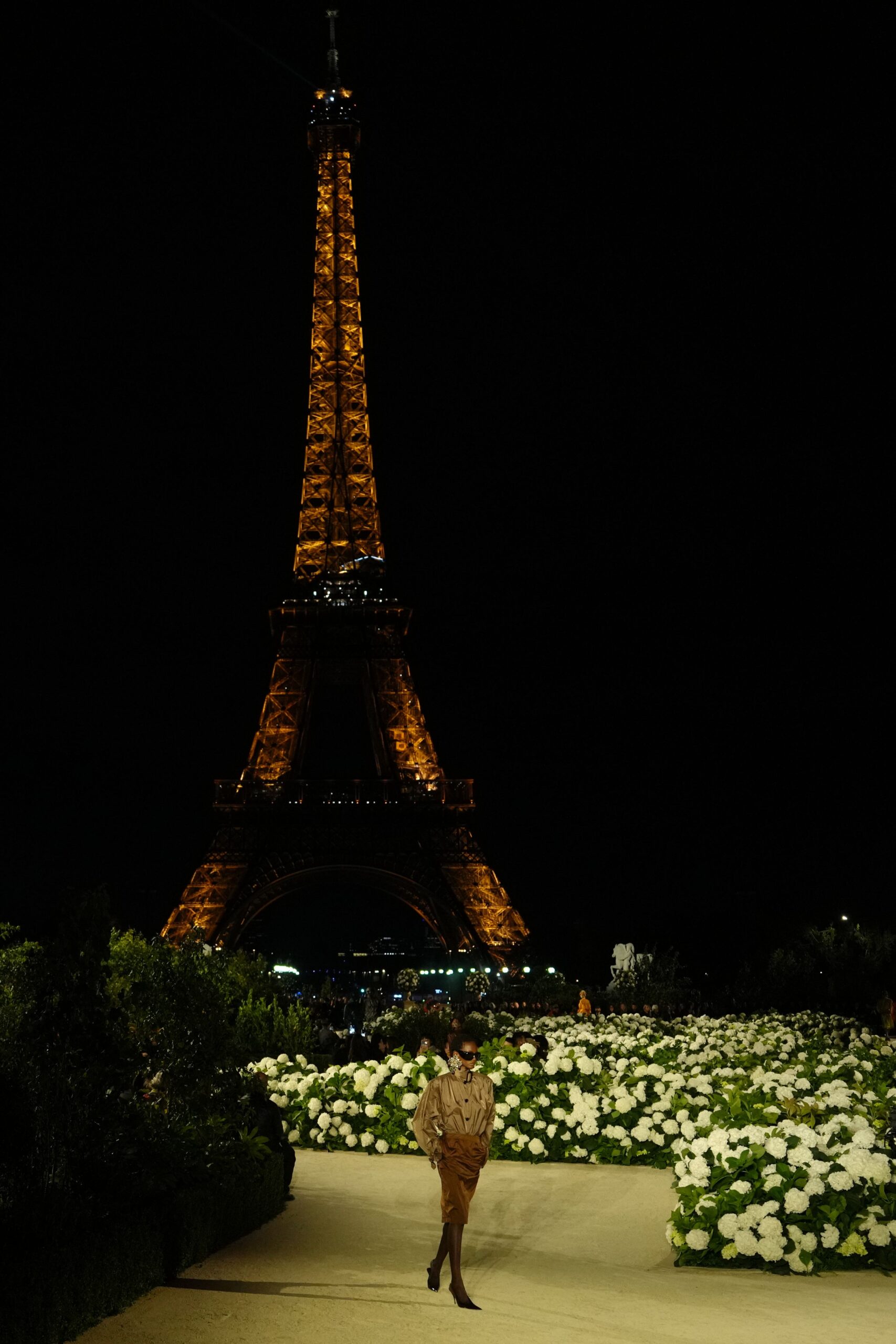 The staging was just as considered as the collection – with the Eiffel Tower sparkling in the background, drones captured the hydrangea hedges carved into the brand’s famous logo. Even the air was scented with YSL’s iconic perfume Opium.