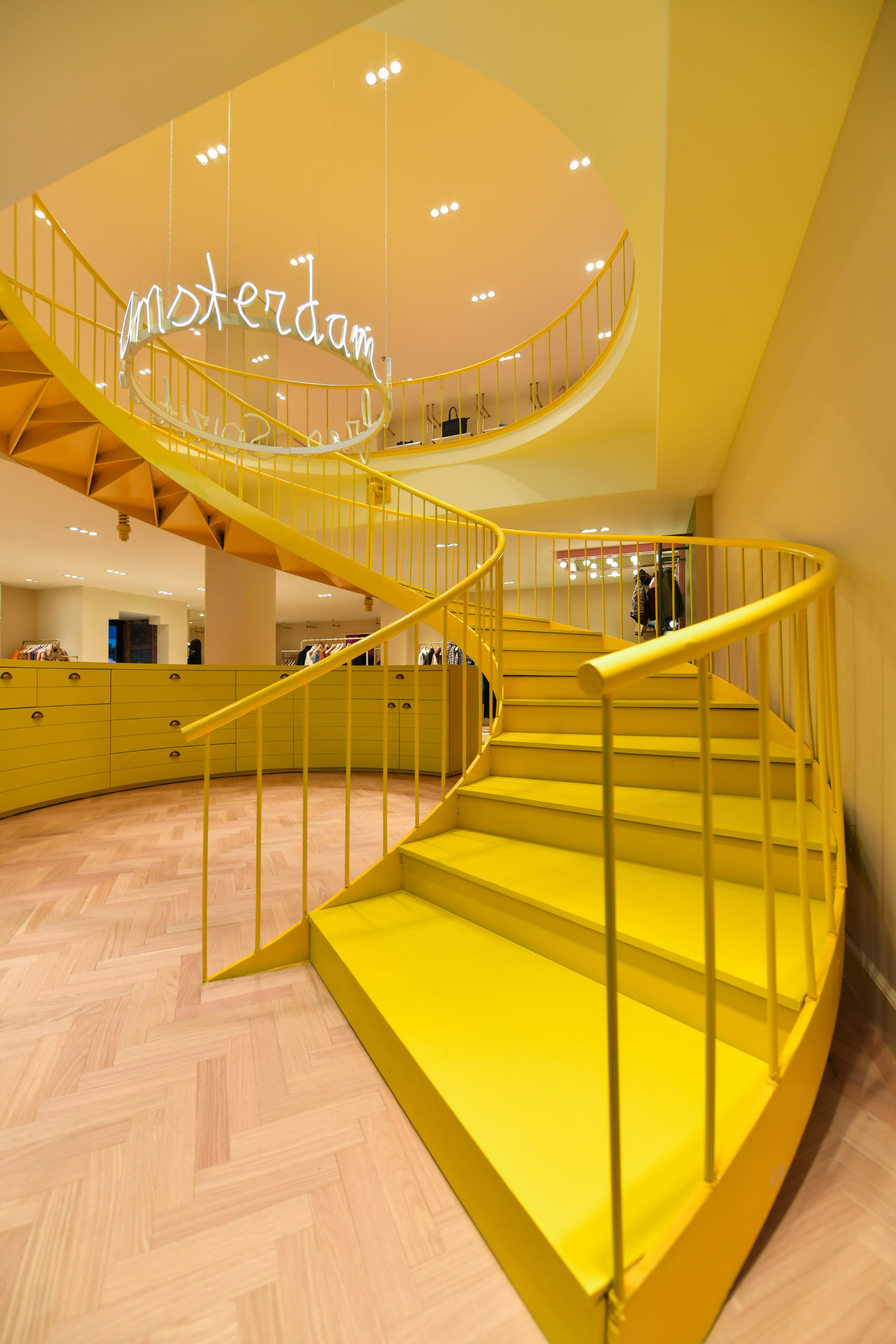 The new store is re-designed under Scotch & Soda’s "Free Spirit" concept, inspired by the power of self-expression and liberal thinking of Amsterdam. Warm colours, bright yellow accents, and neon light installations are designed to inspire in-store visitors and passers-by. Sustainable features of the space include LED lighting, FSC wood herringbone flooring and new hangers made of recycled materials.