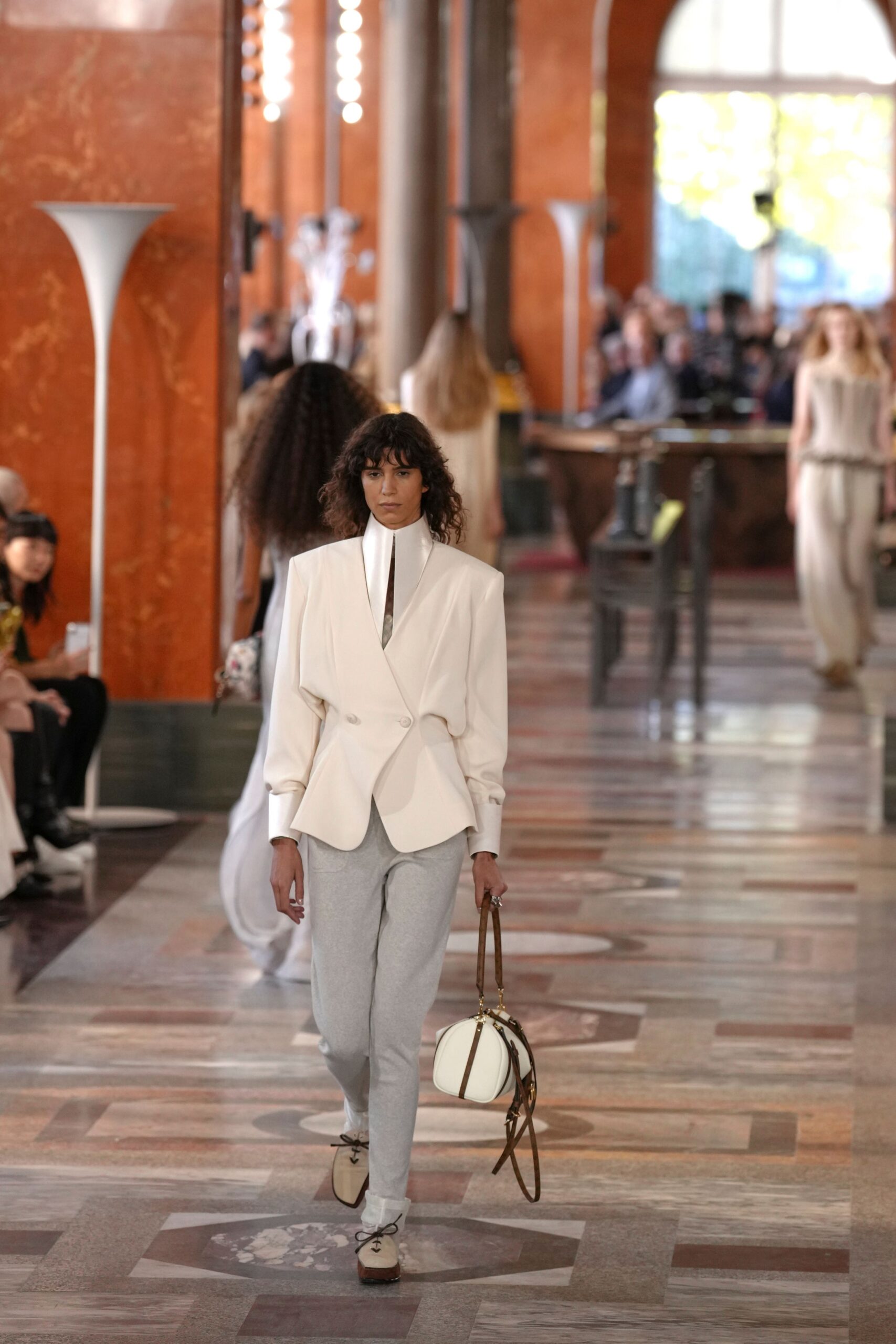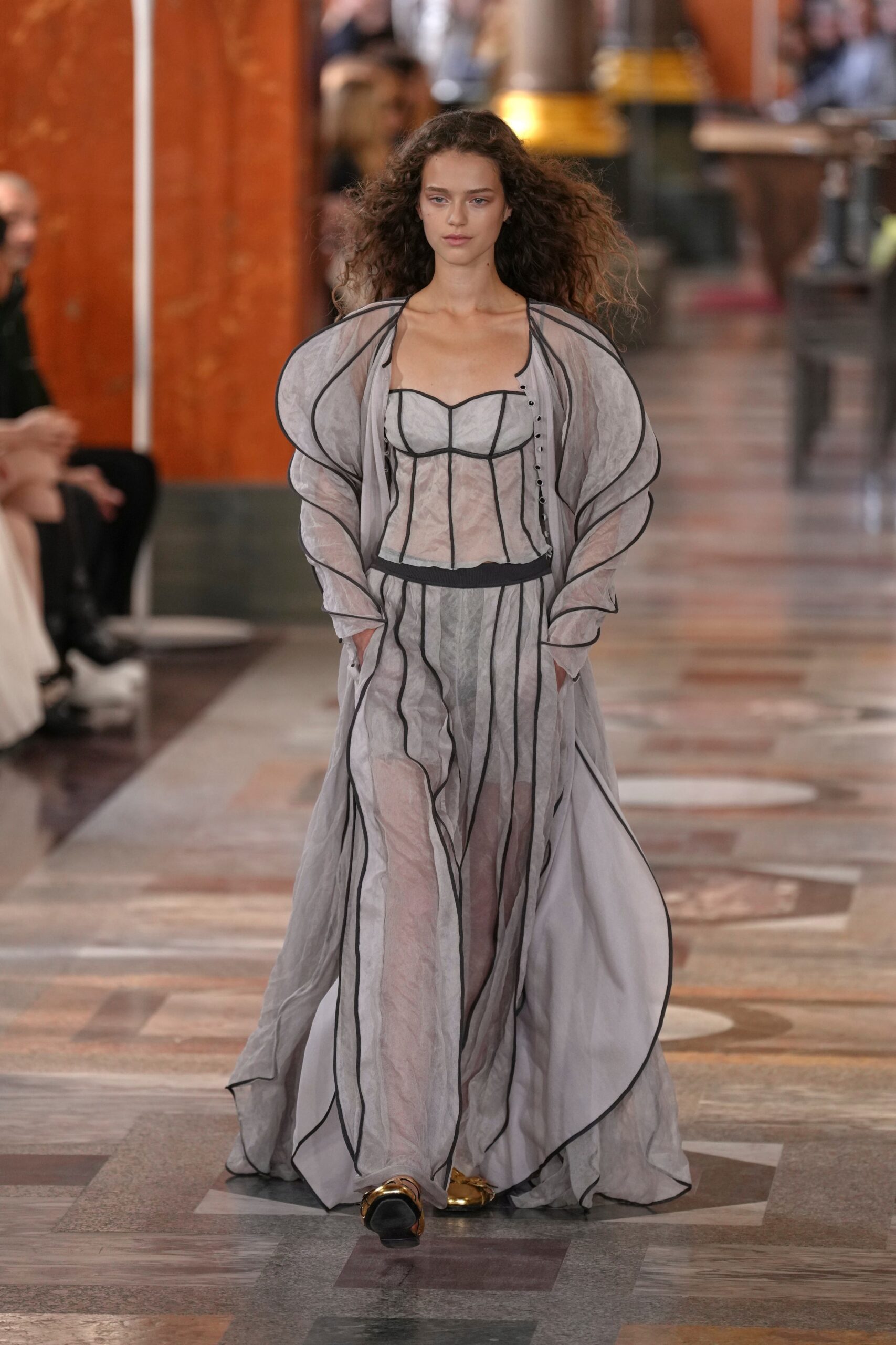 The collection then cycled through dualities: fluid silks and sharply tailored jackets, voluminous drapes and sculpted bodices.