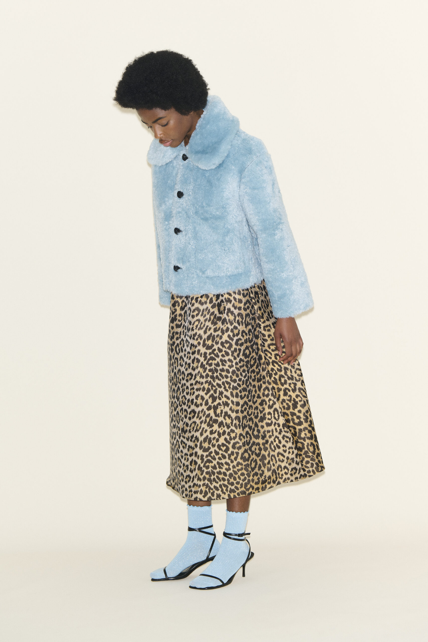 PS26 focuses on a tightly curated edit of statement outerwear and ready-to-wear. Key pieces include the ‘Carrington’ coat (RRP £319) and the ‘Johanna’ reversible shearling jacket (RRP £279), which anchor the collection. On the ready-to-wear side, the dresses are central. There’s ‘Dasha’, in a striking leopard-print (RRP £259), ‘Delaney’, a playful polka-dot dress (RRP £269), and ‘Celeste’, a floor length ivory rose print dress (RRP £199), which has already sold out. Together, they set the tone for the brand.