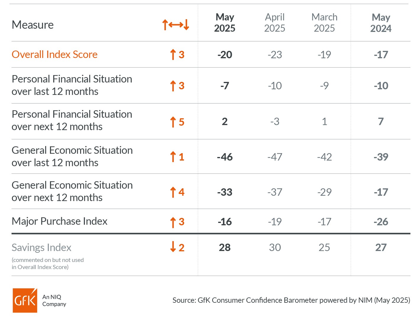 GfK’s long-running consumer confidence index increased by three points but remains firmly in negative territory at minus 20.